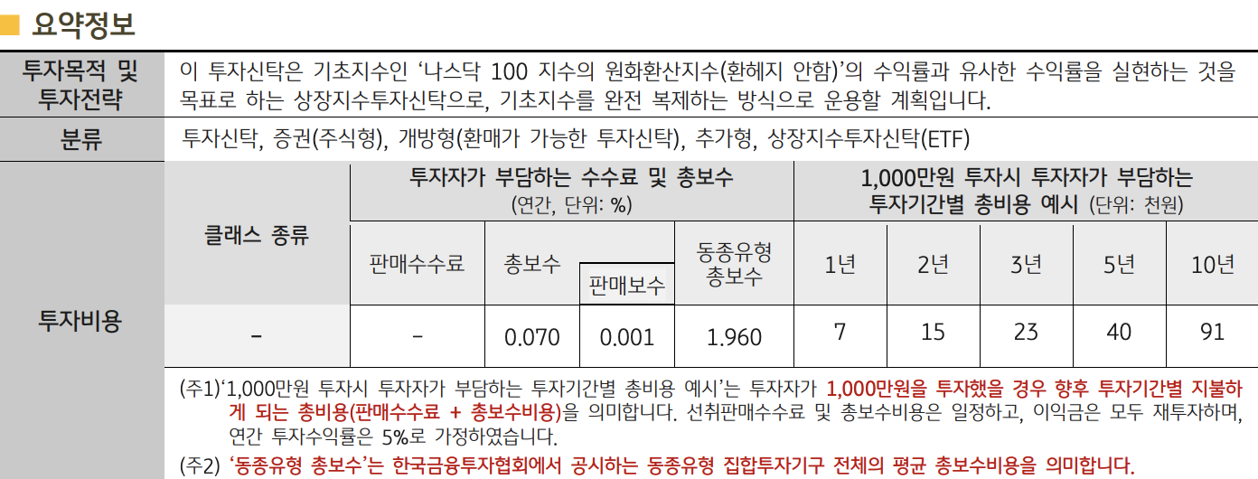 다음으로는 KINDEX 미국나스닥100의 투자설명서인데요. 1,000만원 투자시 투자자가 부담하는 투자기간별 총비용 예시에서 0.07%대로 1년 투자 시 7천원의 비용이 들어갑니다. 어차피 2만원 차이인데 뭘 그러냐는 분들도 있으실 테지만 장기적인 투자에서는 이 수수료 차이가 은근 큽니다.