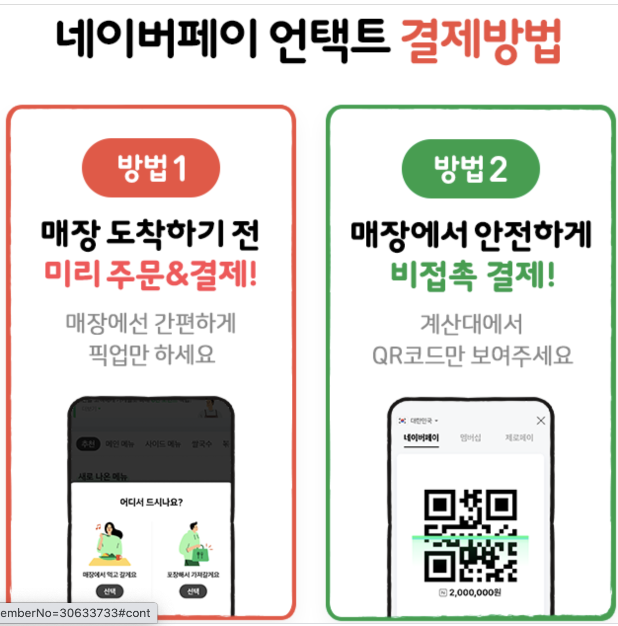 우선 매장 도착하기 전에 미리 주문하고 결제하는 이벤트, 매장에서 안전하게 비접촉 결제하는 이벤트가 있습니다. 이벤트 대상 브랜드도 방법1, 방법2에 따라 달라지는데요.
