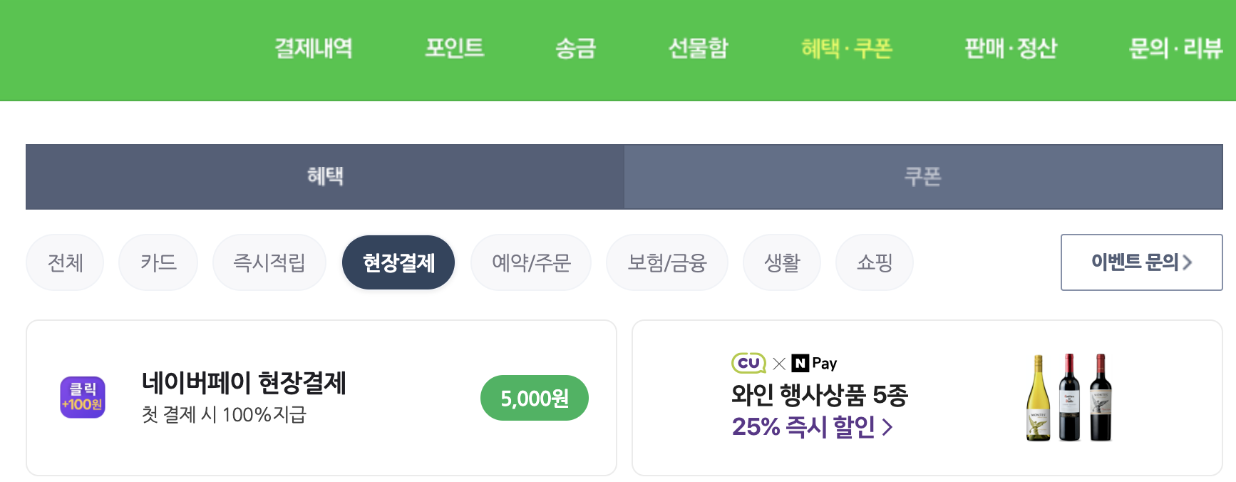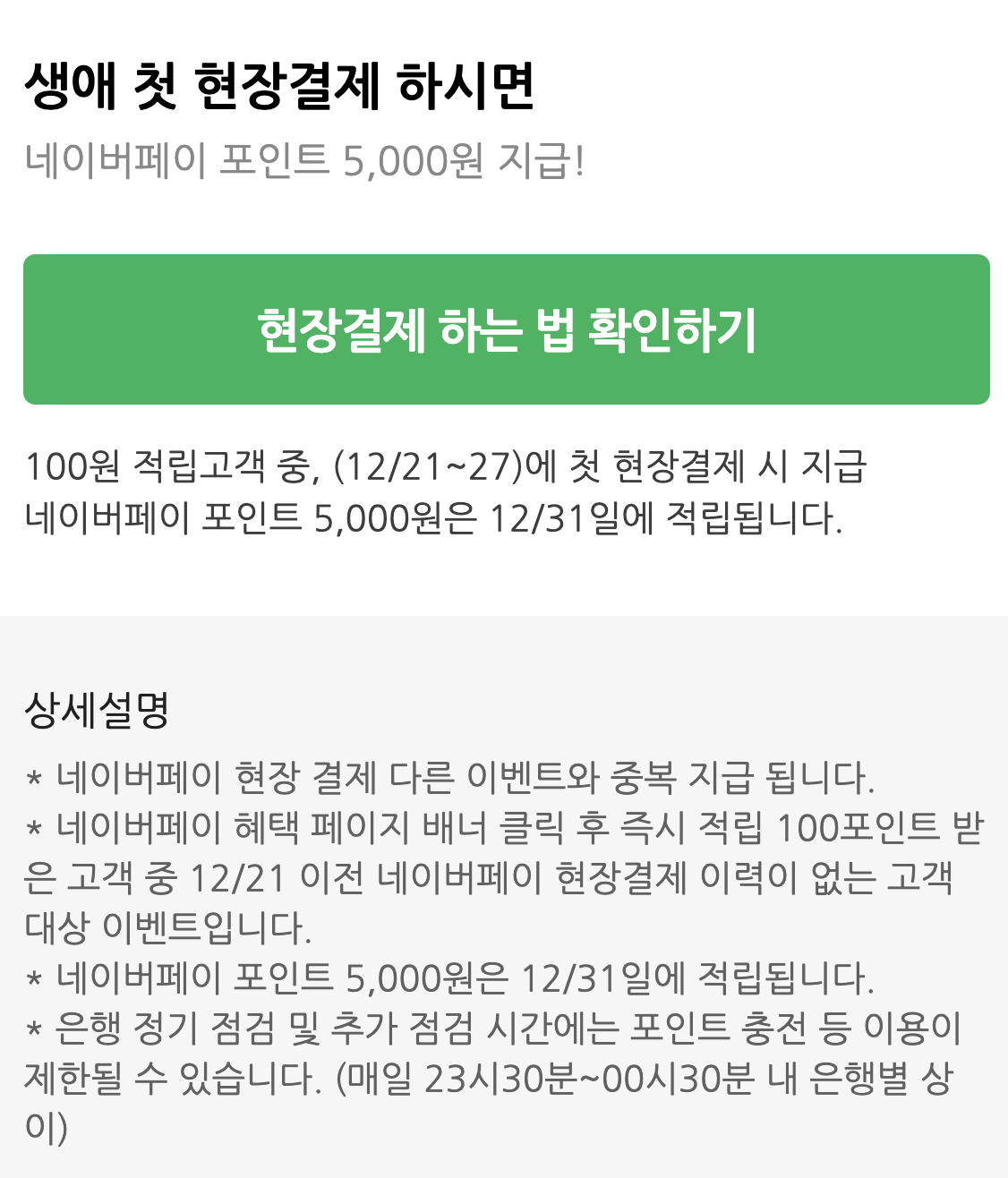 네이버페이 현장결제를 한번도 하지 않으신 분들은 해당 이벤트 먼저 참여하시면 좋은데요. 12월 21일부터 12월 27일까지 첫 현장결제하시는 분들은 네이버페이 포인트 5,000원을 적립받으실 수 있습니다. 사실 상단의 이벤트는 1,000원을 결제하든, 500원을 결제하든 5천원을 페이백을 해주기 때문에 오히려 포인트를 더 받는 셈입니다.