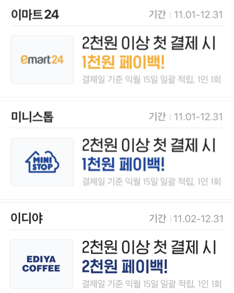 11월 1일부터 12월 31일까지 2천원 이상 첫 결제 시 1천원 페이백도 해주기 때문에 2천원 샌드위치 한 개 사시면 6,000원 페이백이 가능합니다. 저는 편의점 샌드위치를 아침 출근해서 자주 먹는 편이기 때문에 CU에서 첫 결제를 해보려고 하는데요. 이디야커피는 2천원 이상 첫 결제 시 2천원 페이백이기 때문에 제일 효율이 좋긴 합니다. 하지만 저는 이디야 갈 일이 거의 없어서 출근길에 편의점에 들려보려구요^^.
