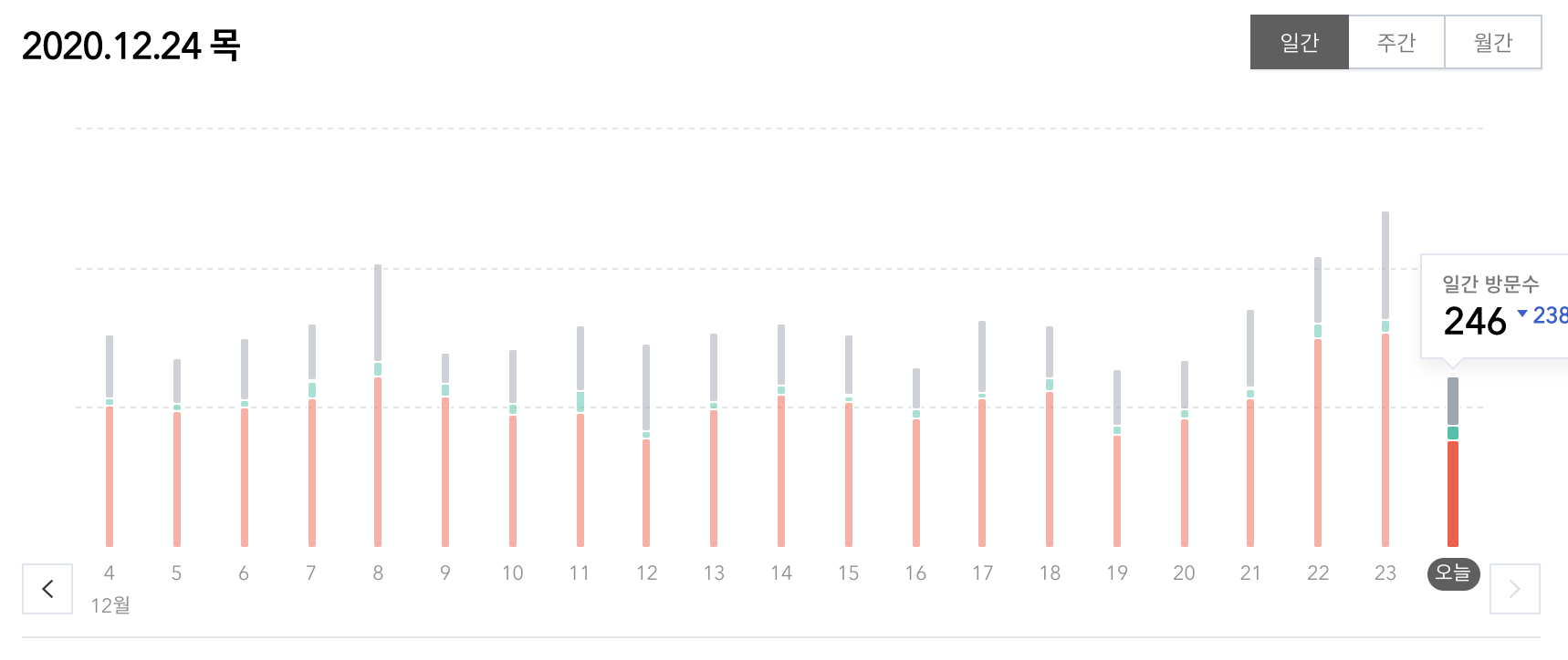 방문자 수는 12월 평균으로 320~350명 정도로 생각하시면 됩니다. 꾸준히 우상향하는 아름다운 곡선이 아니라서 아쉽긴 합니다. 어제는 운이 좋게 484명의 방문자 수를 기록하긴 했지만, 12월 기준으로 보면 320~350명 사이에서 조정이 이어지고 있는 모습이지요^^(엔비디아처럼.....).