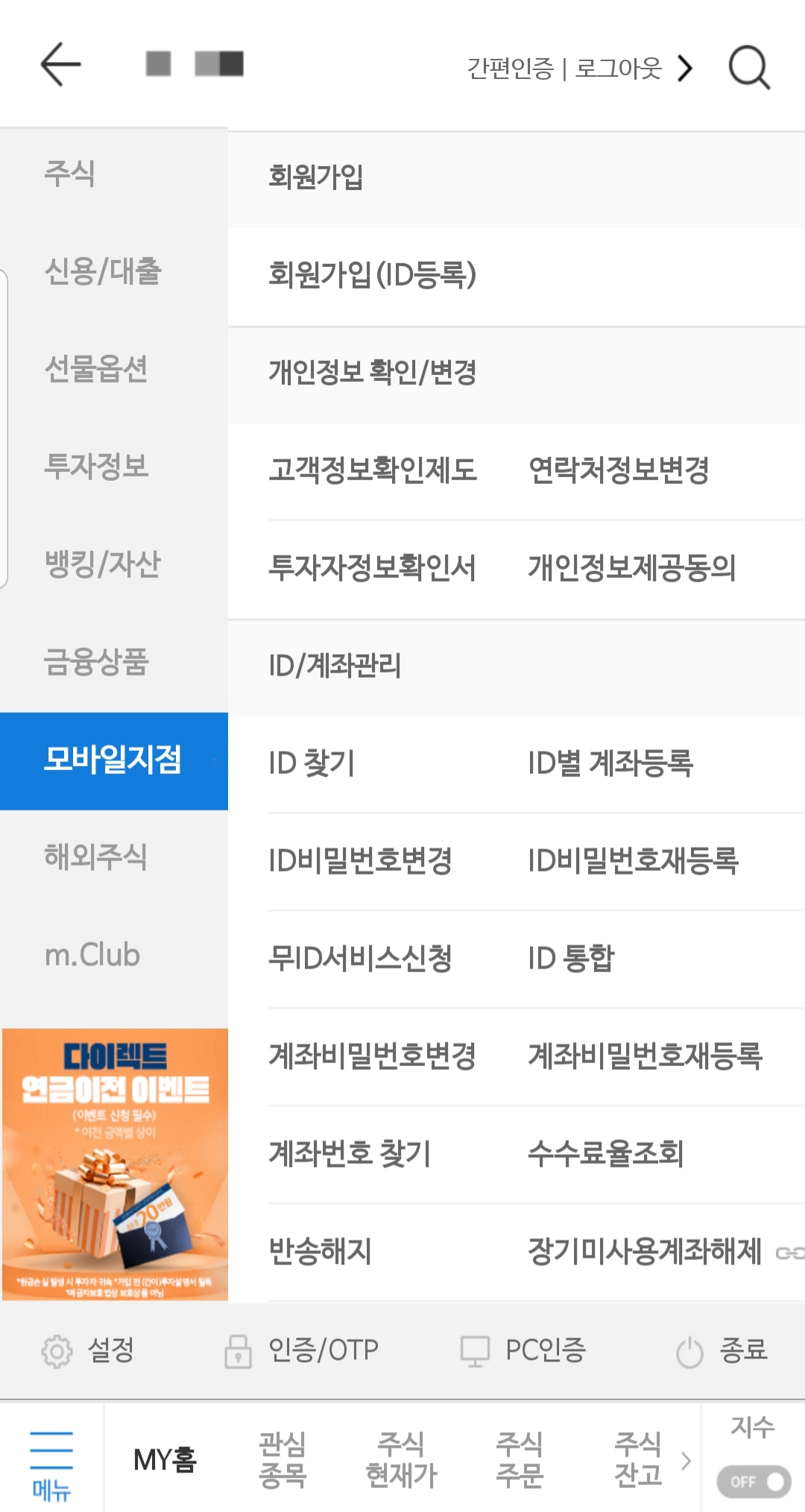 두 번째로는 '모바일지점>ID/계좌관리>수수료율 조회'를 클릭