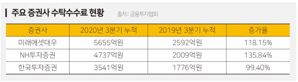 증권사들은 예상대로 2020년 수탁수수료로 얻은 수익이 가파르게 증가하였습니다. 수수료 이벤트를 펼쳤더라도 워낙 투자자 유입이 대폭 증가했기 때문에 이러한 성과를 낸 것으로 추정됩니다.