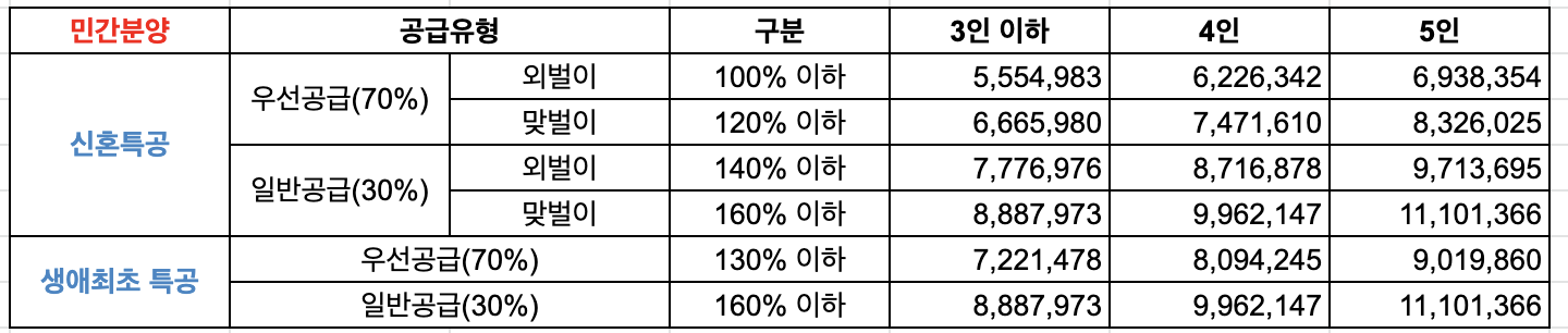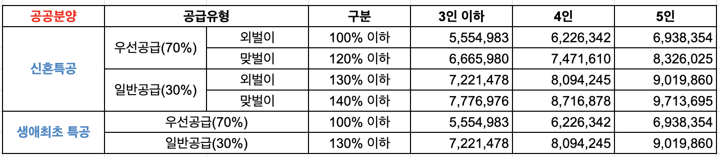 이렇게 구분할 수 있는 국민주택(공공분양)과 민영주택(민간분양)은 특별공급 소득요건에도 차이가 있습니다. 아무래도 민간분양은 시공사에서 수익성을 목적으로 건설하는 아파트인 만큼 분양가가 비싼 편에 속해 소득요건도 그에 맞춰 완화한 측면이 있지요.