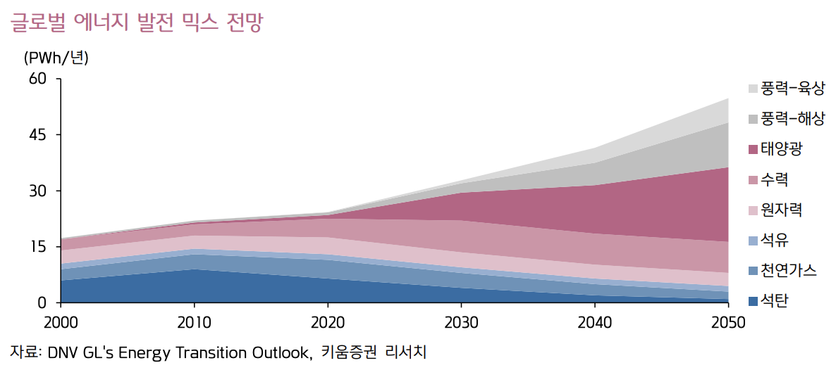 우선, BNE와 SULR은 3개월 성과도 알 수 없는 신생 ETF라서 개인적으로는 제외하였고요. 신재생에너지 중에서도 풍력 에너지, 태양광 에너지, 저 탄소 에너지 등이 있지만 잘 모르겠다 싶으시면 모든 에너지를 포괄하는 ICLN이 좋겠다 싶습니다. 저는 ICLN, TAN, PBW를 눈여겨보고 있고 가능하다면 세 종목 모두 소량 분산투자로 들어가 볼 생각입니다. ETF별로 어떤 기업을 담고 있는지의 비교, 분석 포스팅은 추후 올려보겠습니다. 글로벌 에너지 발전 믹스 추이를 보면 2050년까지 태양광, 풍력에너지가 주류일 가능성이 높아보이긴 합니다.