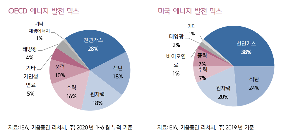 대선 토론에서 줄곧 주장하던 친환경 종목들은 사실 미국 본토에서 반기지 않는 종목들일 수도 있습니다. 미국은 석탄, 석유, 천연가스 등의 전통 에너지의 강국이었지 때문이지요. 제 45대 미국 대통령으로 당선된 도널드 트럼프 에너지 정책은 바이든과 정반대로 전통에너지 자원으로 회귀하자는 주장을 펼치면서 파리협정을 탈퇴하는 행보까지 보였습니다. OECD 에너지 발전 믹스를 미국과 비교해보면 미국이 수력, 풍력, 태양광 등 모든 면에서 부족한 상황임을 확인하실 수 있습니다.