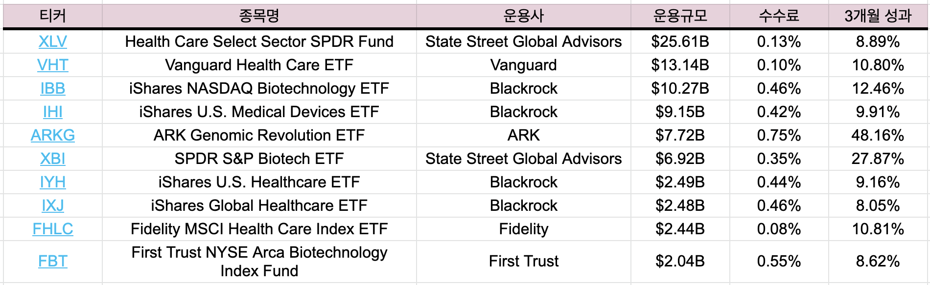 헬스케어에는 바이오테크, 의료기기, 게놈 유전자 혁명 등 다양한 분야가 있는데요. 3개월 성과를 보았을 때 눈에 띄는 종목은 바로 ARKG입니다. 48.16%로 압도적인 성과를 보입니다만 다른 종목에 비해 수수료가 살짝 높은 걸 확인할 수 있습니다. 이 정도 성과 차이라면 수수료는 무시하는 게 더 낫겠다 싶네요. 오바마 케어 당시에는 운용규모 1위인 XLV보다는 IBB가 성과가 높았음을 염두해주시구요. 저라면 ARKG+IBB+IHI 혹은 ARKG+XLV 조합으로 들고 가볼 까 생각 중입니다.