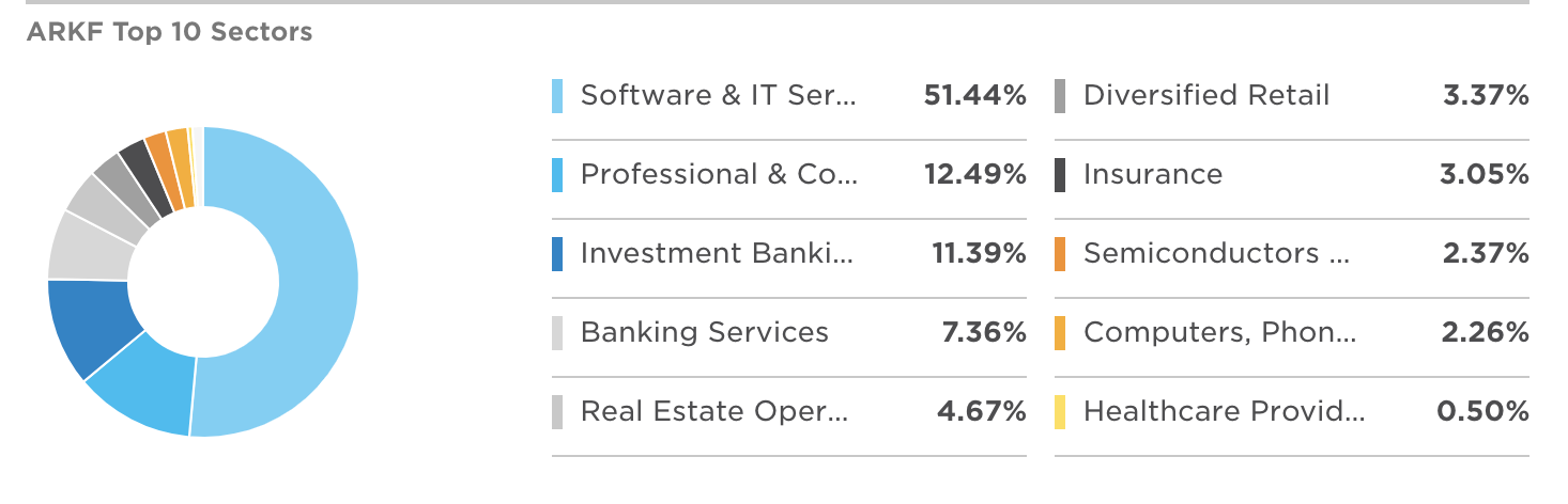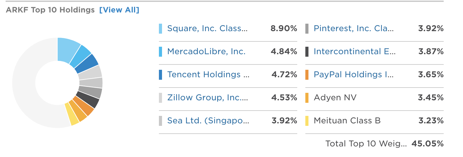 ARKF는 2020년 최고의 액티브 ETF인 ARK 시리즈 중에 하나인데요. ARK 시리즈는 파괴적 혁신을 테마로 한 ETF 시리즈인데, 핀테크도 ARK 인베스트가 보기에는 파괴적 혁신이 일어날 수 있는 산업이라고 여기나 봅니다. 캐시우드 느님의 선택을 받은 기업들이 무엇인지 살펴보도록 하겠습니다.