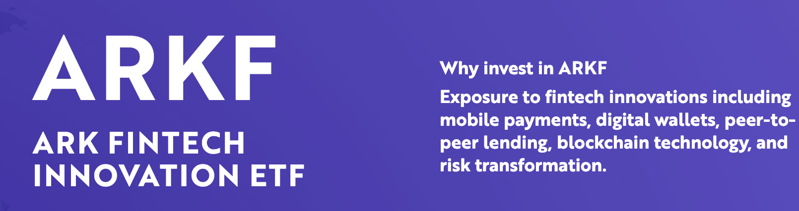 ARKF는 FINZ와 달리 적극적으로 운용되는 액티브 ETF인데요. ARKF가 투자하는 기업의 기준은 두 가지입니다. 첫 번째는 핀테크 테마에서 상당한 매출을 내고 있거나, 시장가치를 올리고 있는 기업이거나, 두 번째는 핀테크 테마에 중점을 둔 제품과 서비스를 갖고 주된 사업을 하느냐 입니다. "Fintech 혁신"을 기술적으로 가능한 새로운 제품 또는 서비스의 도입으로 정의하고 있는데요. 금융 거래 혁신, 블록체인 기술, 비대면 대출 플랫폼, 중개서비스가 테마의 종류입니다.