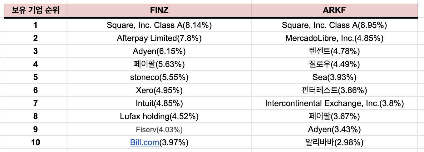 구성종목도 1위인 스퀘어를 제외하고는 아예 다릅니다. FINZ는 Indxx Global FinTech Thematic Index를 추종하는 펀드인 반면, AKKF는 운용사의 지시에 따라 활동적으로 움직이는 액티브 펀드이기 때문에 그럴 수 밖에 없는데요. spy, voo 등의 지수 추종 etf를 비교하는 것과는 다르게 접근하는게 맞겠지요?