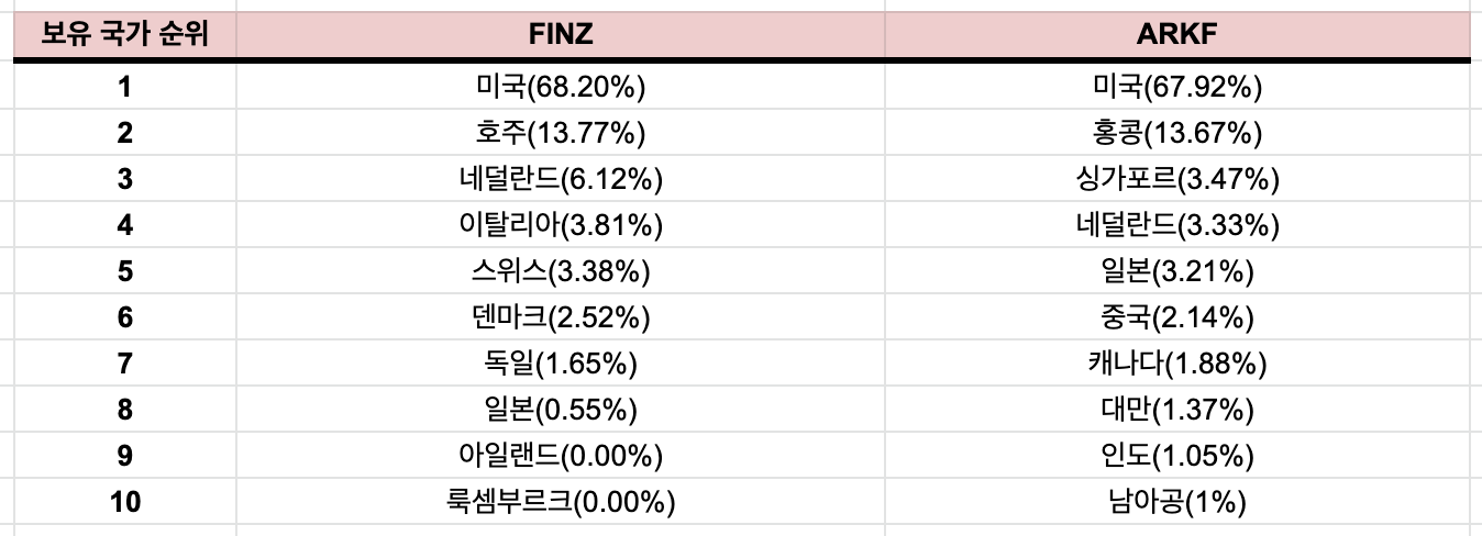 앞서 말씀드렸듯이 FINZ는 미국 시장을 선두로 하여, 유럽 등의 선진국 기반의 핀테크 시장에 투자하는 etf이며, ARKF는 미국 시장을 선두로 하여 아시아 시장에 뒤이어 투자하는 etf라고 보시면 되겠습니다.