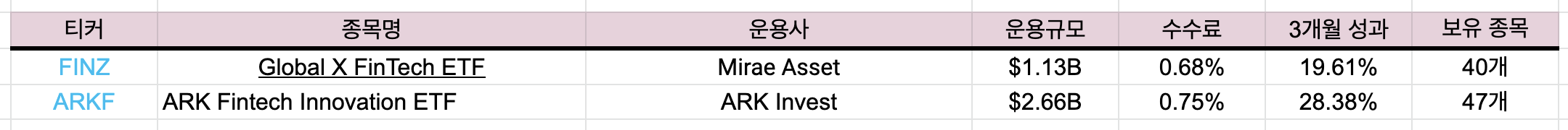 FINZ와 ARKF의 수수료는 각각 0.68%와 0.75%로 ETF 수수료치고 높은 편입니다. 3개월 성과를 고려하면 ARKF가 9% 가량 높은 편이며 운용규모도 신생 etf임에도 불구하고 운용규모가 두 배가 되는군요. 확실히 ARK 인베스트의 네임 밸류와 퍼포먼스가 규모 확장에 영향을 끼친 듯 합니다.