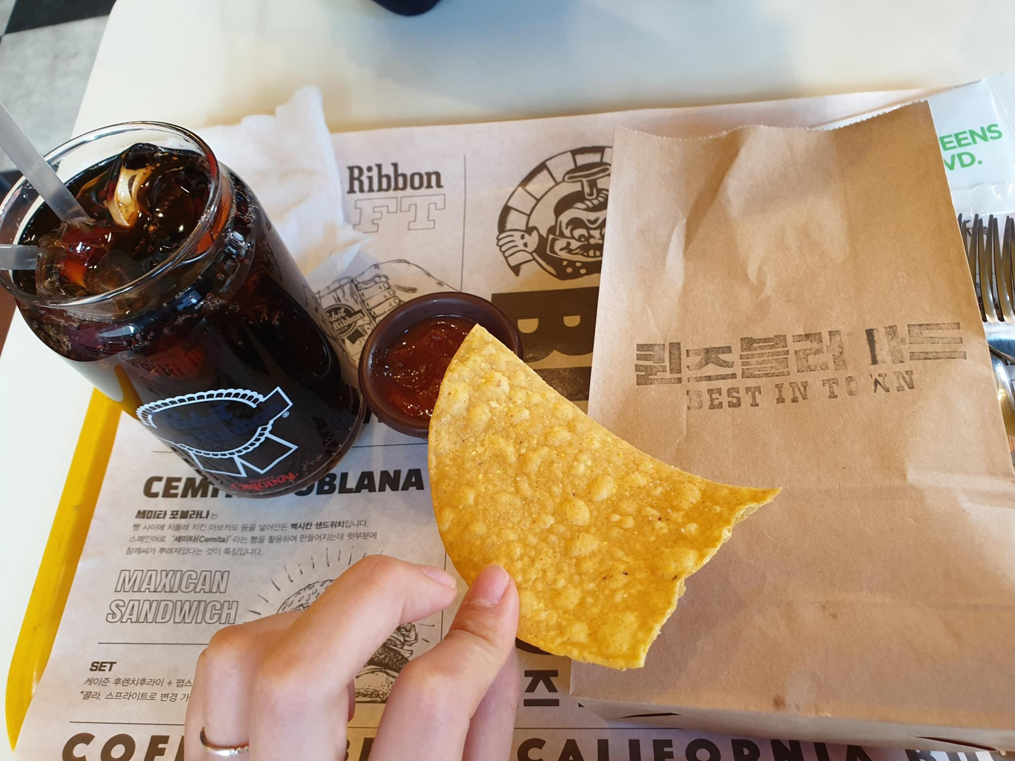 콜라 컵이 굉장히 귀엽고 인상깊었어요~~딱 퀸즈블러바드 소품이라고 해도 손색이 없었습니다. 나초는 생각보다 크기가 컸어요. 손바닥 반만한 크기에 반달 모양인데 딱 그 담백한 나초 그 맛입니다!