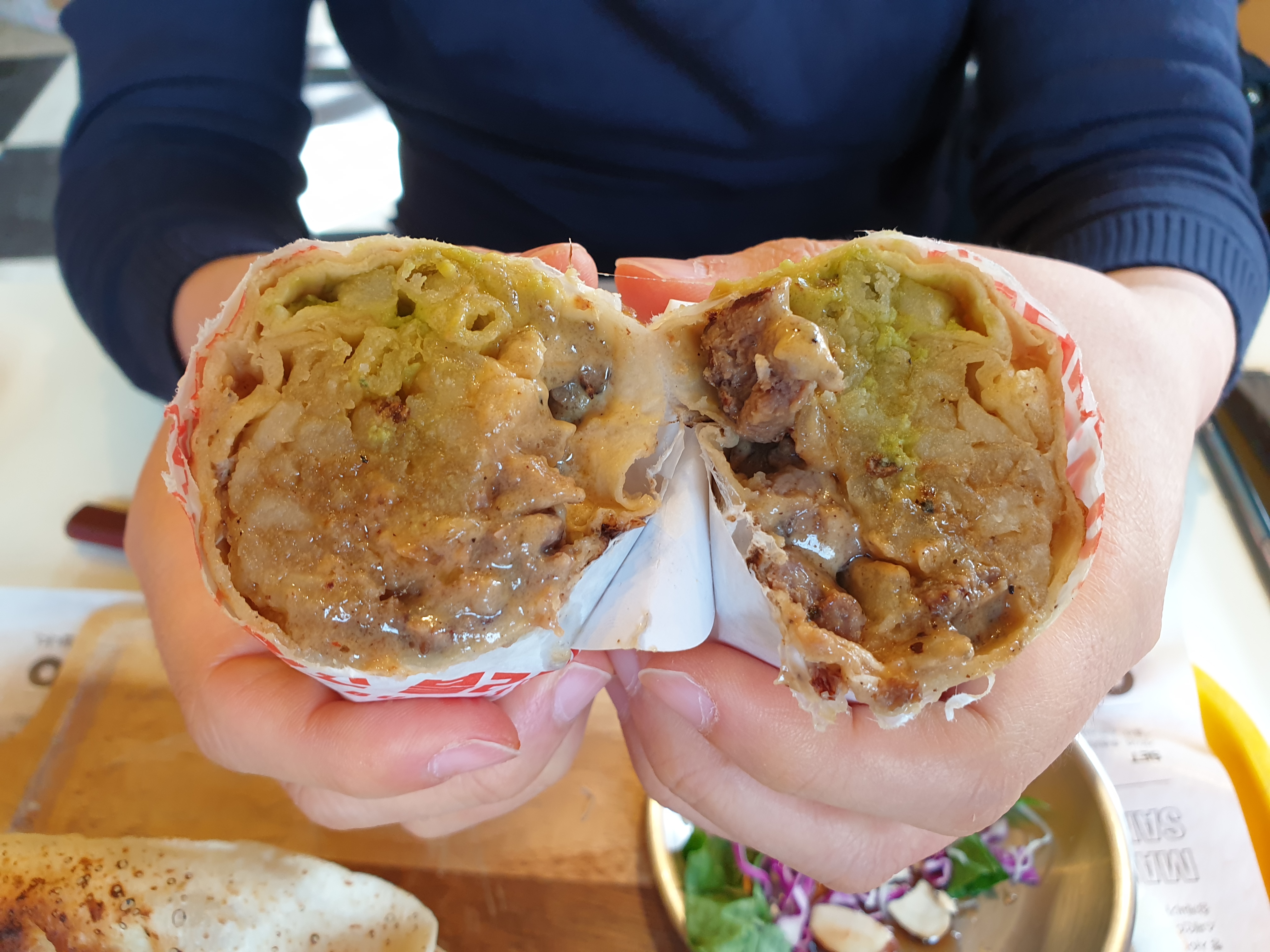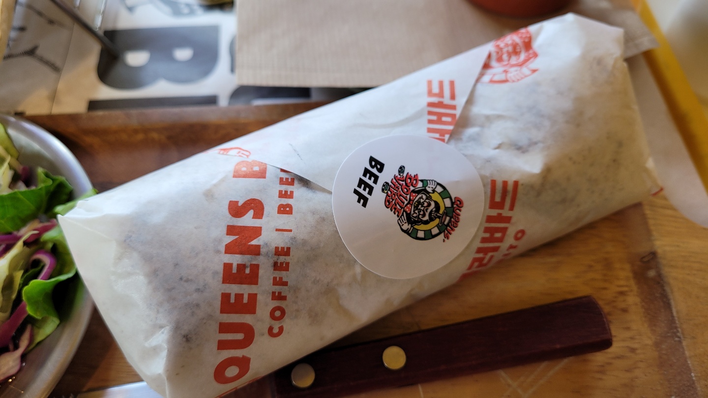 캘리포니아 부리또는 이 집의 시그니처 메뉴인데, 다른 곳과 달리 밥이 아닌 감자튀김이 들어가있어요! 사실 감자튀김이 들어간 메뉴는 맛없을 수가 없지요. 샐러드볼, 타코는 간이 약한 반면에 부리또는 딱 적당했어요! 이 곳의 시그니처 메뉴가 왜 캘리포니아 부리또인지 느끼는 맛이었달까요? 밥이 아니라 감튀라 너무 기름지진 않을까 싶었는데, 매콤한 맛이 그 느끼함을 잡아줬습니다.