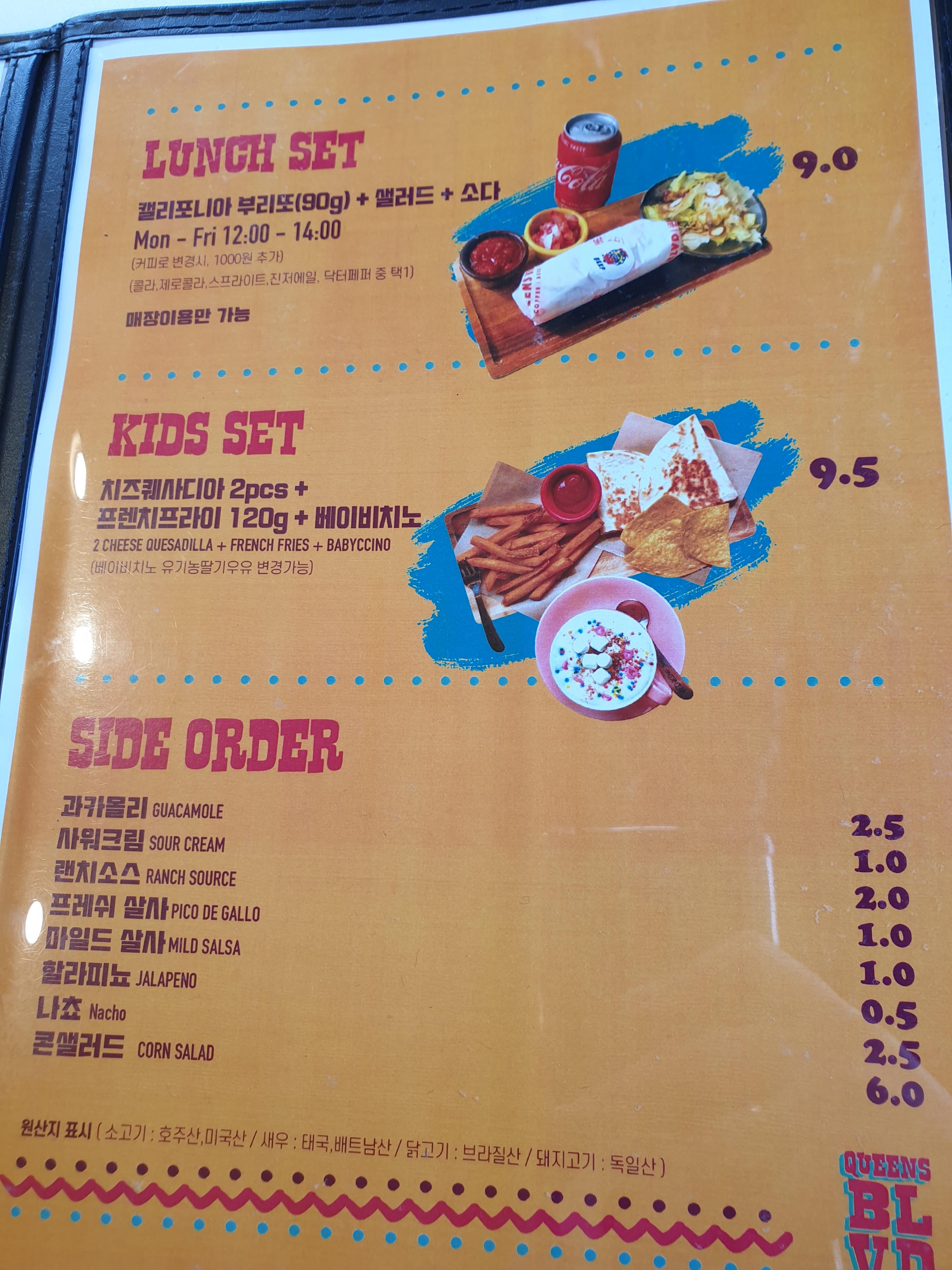 런치세트와 키즈세트도 있는데요. 런치세트는 이 곳의 시그니처 메뉴인 캘리포니아 부리또입니다. 샐러드와 음료까지 9,000원으로 제공하고 있어요. 키즈는 베이비치노가 드링크메뉴인데 유기농 딸기우유로 변경이 가능하다고 합니다ㅎㅎ. 사이드메뉴로는 과카몰리, 사워크림, 랜치소스, 살사소스, 할라피뇨, 나쵸, 콘샐러드가 있어요. 미리 말씀 드리지만, 이 곳은 소스가 그렇게 후한 편은 아니라서,,, 사이드 메뉴가 필수일 수가 있어요...