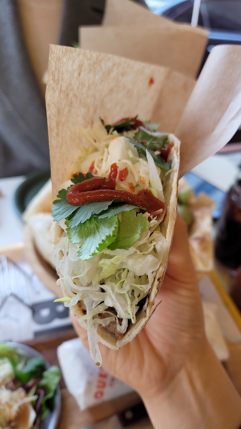 저희가 먹은 타코는 까르네아사다 타코인데요. '까르네아사다'는 구운 소고기라는 뜻인데 먹어보니 딱 그 또띠아 샌드위치 느낌이 났어요. 좀 더 특이(?)하다고 느낀 점은 소스가 없다는 점? 저는 기본 베이스 소스가 있을 거라고 생각했는데 사워소스나 과카몰리 같은 양념은 없고, 양상추, 고수, 양파, 스테이크가 내용물이었습니다. 때문에 싱거운 편이니, 칠리 소스를 뿌려드시는 게 좋아요! 아니면, 과카몰리를 추가하셔도 좋고요!