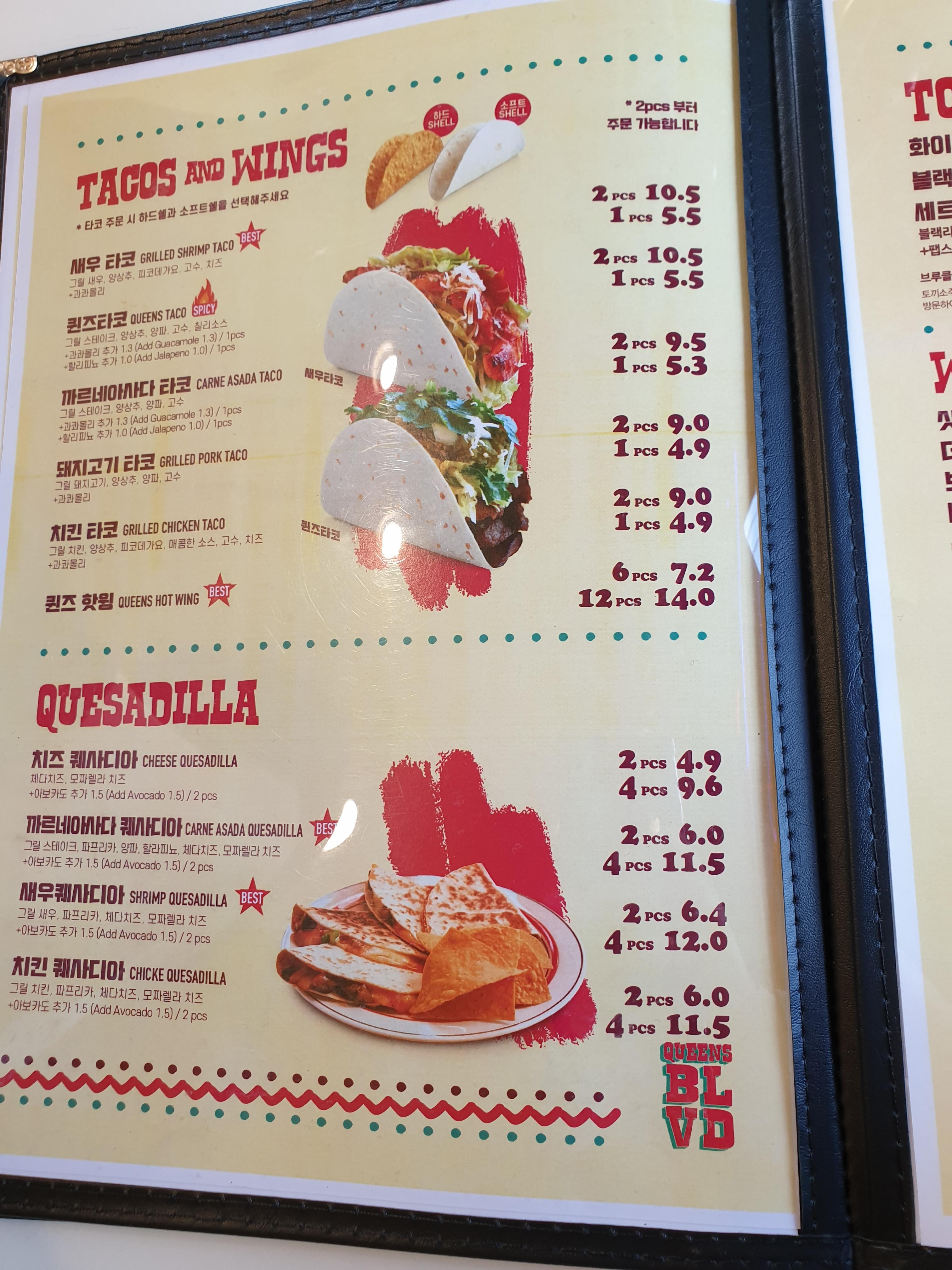 우선, 세트메뉴가 있는데요. 퀸즈 세트로는 (캘리포니아 부리또 or 까르네아사다 프렌치 프라이)+(새우 타코)+(카르네 아사다 퀘사디아 or 퀸즈 핫윙)으로 29,900원입니다. 2~3인용에 적합한 양이라고 해요. 패밀리 세트는 캘리포니아 부리또+까르네 아사다 프렌치프라이+새우 타코4+ 까르네 아사다 퀘어디아 4+퀸즈 핫윙 12개로 72,000원입니다. 식사 후, 간단히 맥주를 마시기에는 비어 세트가 적합한데 스위트 포테이토 프라이+생맥주 4잔 조합에 35,600원입니다.