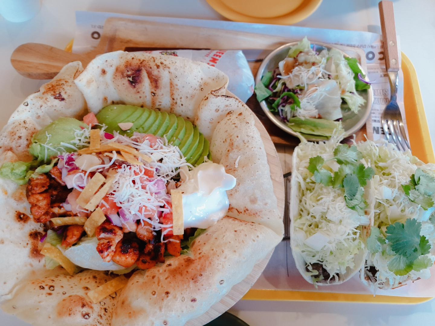 얼마되지 않아, 샐러드볼, 부리또 런치세트, 타코가 바로 나왔어요. 아 참, 샐러드볼은 특이하게도 또띠아 볼이라서 비주얼이 참 예쁘죠~~아보카도를 추가한 메뉴랍니다.