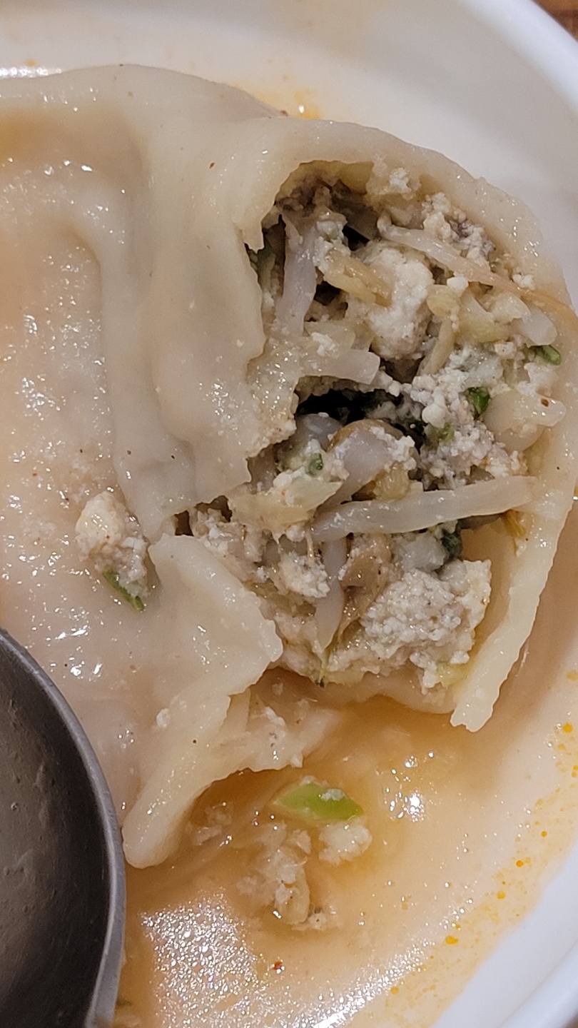 두꺼운 만두피를 펼쳐보니 안에 숙주, 부추, 두부, 마늘, 파, 고기로 어우러진 만두속이 어우러져 있었습니다. 만두속은 담백하고 심플한 맛을 자랑했습니다. 이북식 만두는 손바닥 만한 크기의 만두로 몇 개만 먹어도 배부를만 한 만두라고 하는데, 확실히 3개 정도 먹으니 배가 차는 듯한 느낌이 들었어요.