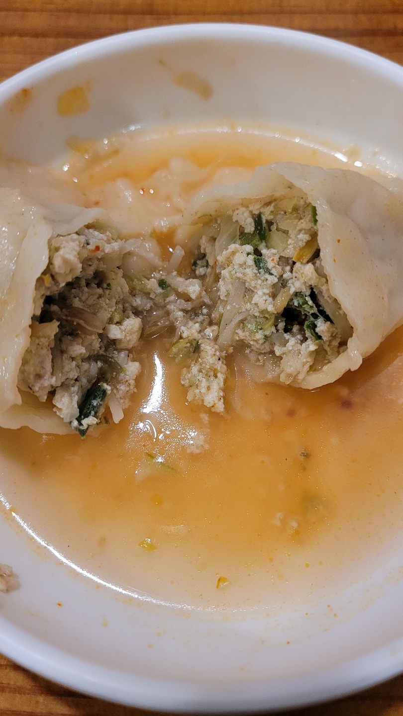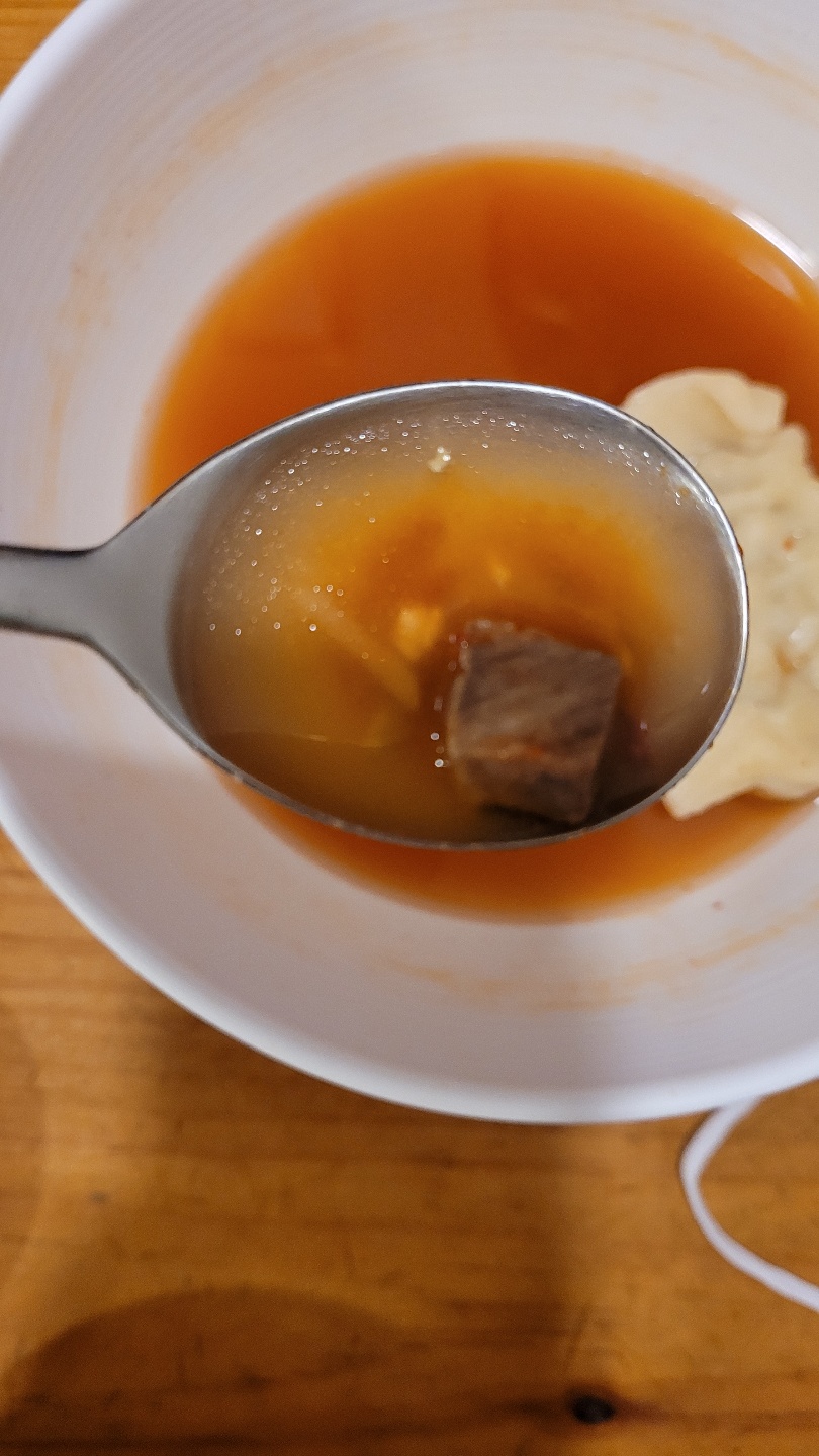 빨간 육수를 만두에 적셔서 만두를 갈라봤어요. 육즙이 많지 않은 만두라서 그런지 국물과 함께 곁들여 먹으니 더 깊은 맛을 자랑했습니다.