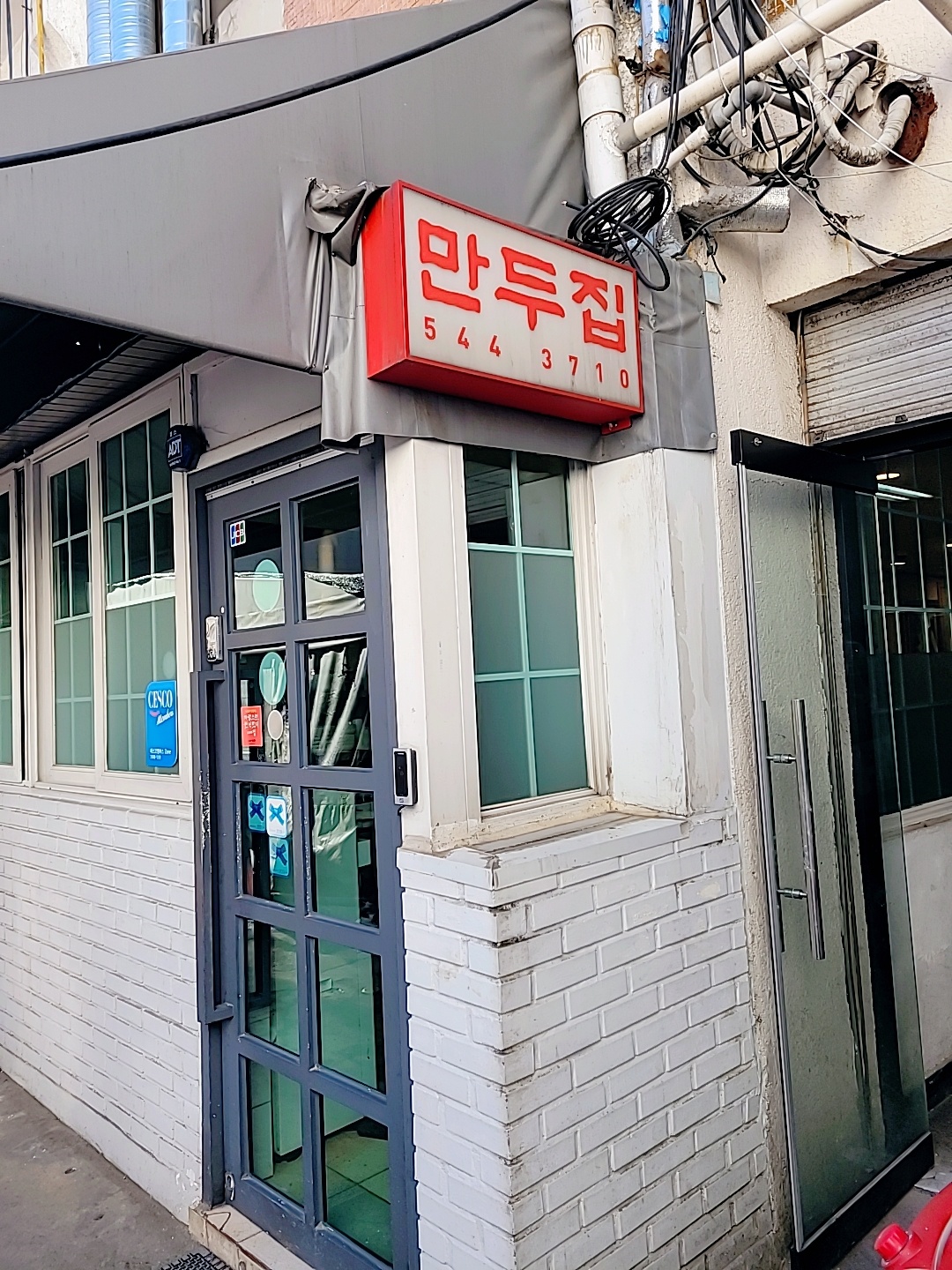 가게 입구를 찾으시려면 건물 정면이 아닌 측면으로 들어오셔야 하는데요. 정면 간판에 만두집 간판이 2층에 걸려있어서 2층인가 싶었더니 측면으로 들어오니 만두집 입구가 있더군요. 블루리본서베이 가이드북에도 여러 번 선정된 맛집인가 본지 문 앞에 블루리본서베이 스티커도 붙여져 있습니다.