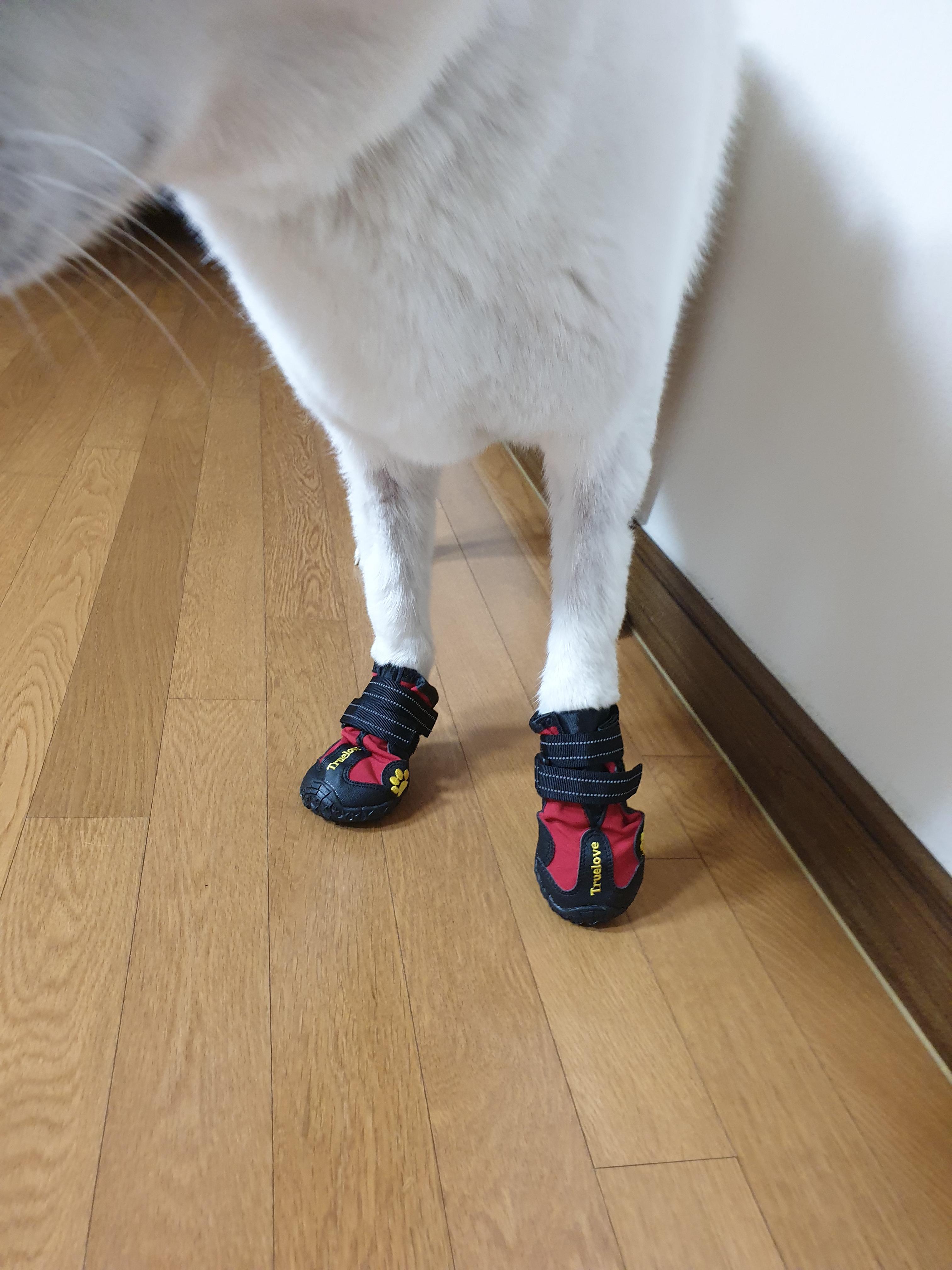 이 신발의 가장 큰 장점은 혼자 신길 수 있다는 겁니다. 라텍스 신발은 3명은 달려들어야 했는데 너무 편리합니다. 몸에 비해 앙증맞은 시리의 발. 비만 직전이라 다이어트가 필요한 몸뚱아리인데, 간식을 너무 좋아해요ㅠㅠㅠ