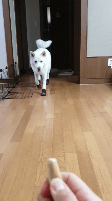 간식이라면 어떠한 상황에도 달려드는 시리지만 신발 두 켤레 신고서는 망부석처럼 자리를 지키고 있습니다. 나머지 두 켤레도 마저 신기기로 합니다. 이제 네 발에 다 신발을 신기니 더 망부석이 됩니다. 이럴 때 필요한 게 최애 간식이지요!