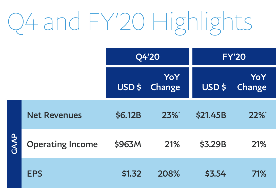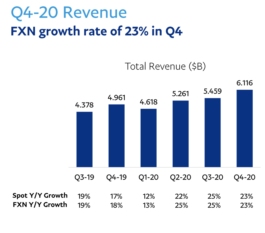 위와 같은 사업 구조로 페이팔은 2020년에 전년 대비 22%의 매출 성장을 이루었고, 21%의 순이익 성장을 이루었습니다. 2020년 4분기만 살펴보면 지난 해 동분기 대비 매출은 23%, 순이익은 21% 성장한 모습이구요. 주당 순이익은 무려 4분기에 208%의 성장세를 보였습니다.