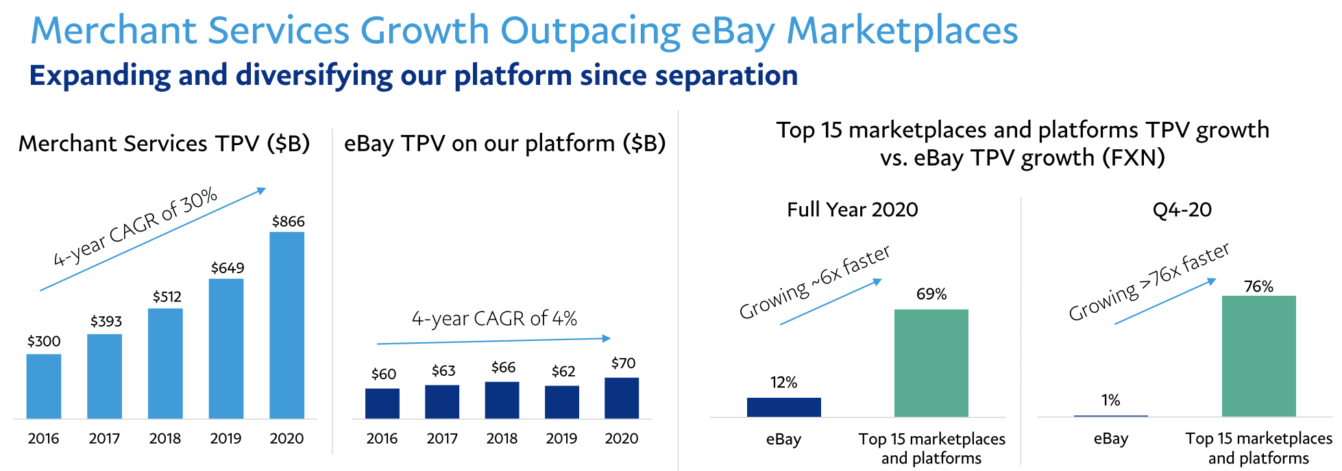 페이팔은 이베이의 자회사지만 분리된 이후로 각자의 길을 걷게 되었는데요. 2019년까지 페이팔은 이베이 사이트에서 다른 직불카드나 신용카드 옵션보다 우위의 지위를 가지고 있었지만, 이제는 동등한 지위를 갖게 되었습니다. 때문에 이베이 이외의 다른 가맹점으로 확대해나가는 노력을 펼쳤고요. 그 덕분에 기타 가맹점에서의 거래규모는 4년간 30%의 증가율을 보였습니다. 2020년 전발적으로는 이베이에서의 거래규모 증가율보다 기타 가맹점에서의 거래규모 증가율이 6배 높았고, 4분기에서만 76배 높은 실적을 냈습니다.