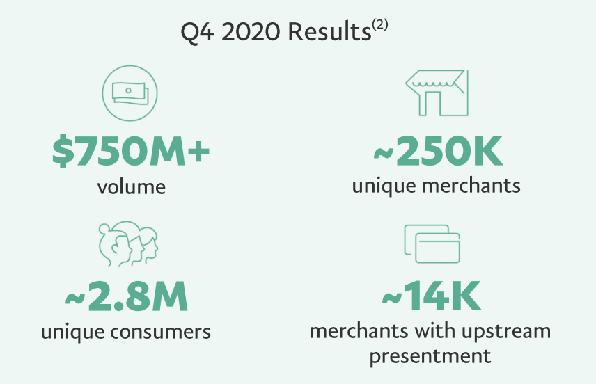 페이팔은 2020년 4분기 7억 5000만달러의 매출을 해당 서비스에서 기록하였고, 250,000개의 가맹점, 280만 명의 소비자를 유치했다고 합니다.