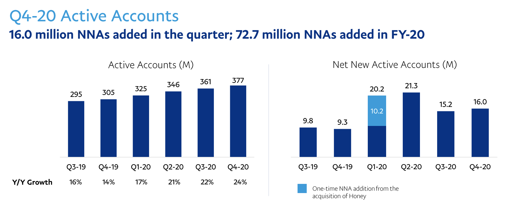 활성계좌는 3억 7700만개로 전년 동분기 대비 24% 증가한 수치를 보입니다. 계좌를 가입자 수로 추산하면, 페이팔 가입자 수가 3억 7700만 명이라고 보시면 되는데요. 미국 전체 인구 수가 대략적으로 3억 2000만 명이니 페이팔이 미국 이외에도 가입자 수를 넓혀나가고 있다고 보시면 될 것 같습니다. 저도 4분기에 페이팔에 가입하였는데 증가한 1600만 개의 계좌 중에 한개가 되겠군요....ㅋㅋㅋ 우리나라의 카카오페이나 토스와 같은 간편결제 시스템도 편리하지만 사실 우리나라는 내수가 너무 작아서ㅠㅠㅠ핀테크 글로벌 확장으로는 어려울 것 같긴 합니다.