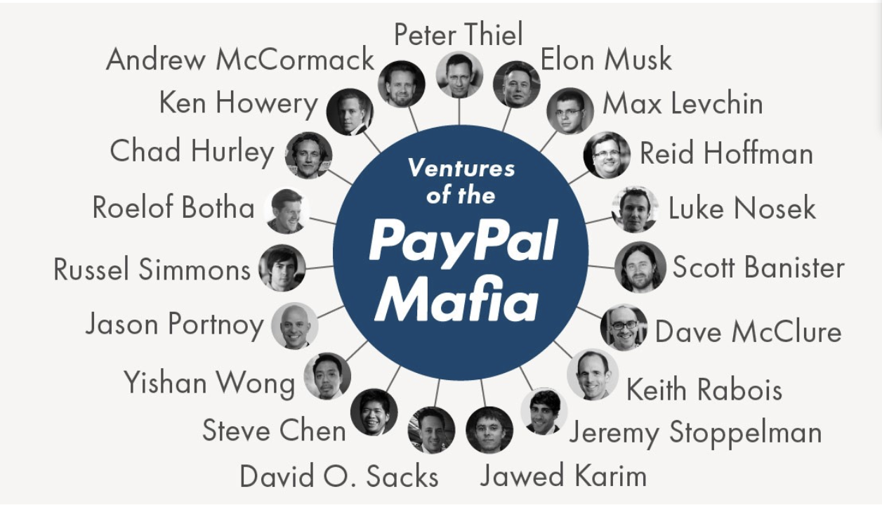 페이팔은 2002년 이베이에 약 1조 6303억원에 매각되면서 창립 멤버들은 돈 방석에 앉는데, 창립 멤버들은 그 돈으로 재창업 혹은 투자를 거듭하면서 '페이팔 마피아'라는 거대한 조직이 탄생하게 되었습니다. 페이팔 마피아라고 해서 뒷돈이 오간다거나 그런 것은 아니고, 거대 자본을 가지고 있는 개개인들이 서로의 아이디어를 공유하는 모임이라고 보시면 됩니다.