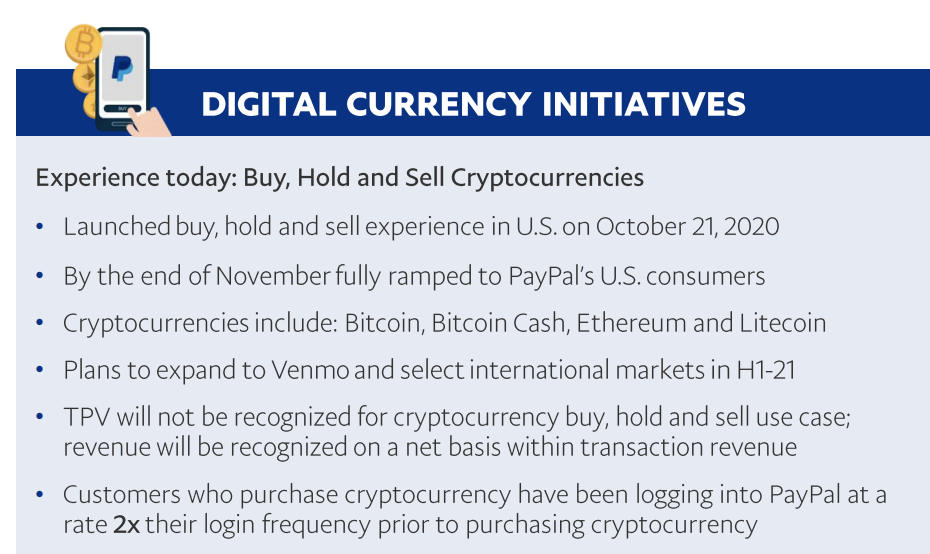 페이팔은 전자상거래에서의 간편결제 뿐만 아니라, 은행계좌를 연결하여 송금이 가능케 하는 서비스도 제공하고 있고, 비트코인을 사고 팔 수 있는 서비스를 제공하기 시작하면서, 해당 서비스가 2020년 4분기 매출을 견인하였다고 합니다. 비트코인에 대한 매출에 대해 회의적인 시각을 갖고 계신 분들은 조금 조심스럽게 다가가야 하는 주식이 되었다고 생각합니다만, 비트코인에 대한 간접 투자 정도는 감수하신다면 페이팔을 소량 매수하시는 것도 나쁘지 않다고 생각합니다.