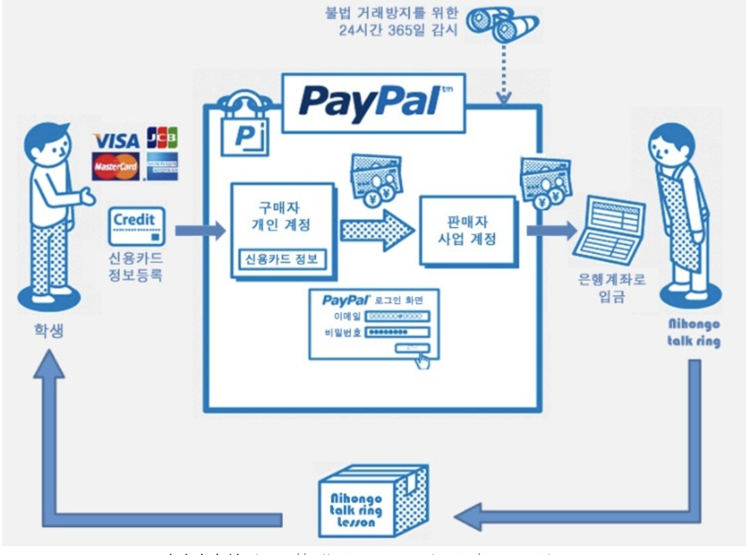 페이팔의 간편결제 시스템은 상단의 구조로 이루어집니다. 수수료는 소비자에게 부과하는 것이 아니라, 사업자(판매자)에게 부과하는데 대략 기본 30불에 판매대금의 3-4% 정도라고 합니다. 소비자는 수수료도 안 내는 페이팔 시스템을 사용하지 않을 이유가 없고, 판매자는 수수료를 감수하고서라도 페이팔 서비스를 이용할 수 밖에 없을 겁니다.