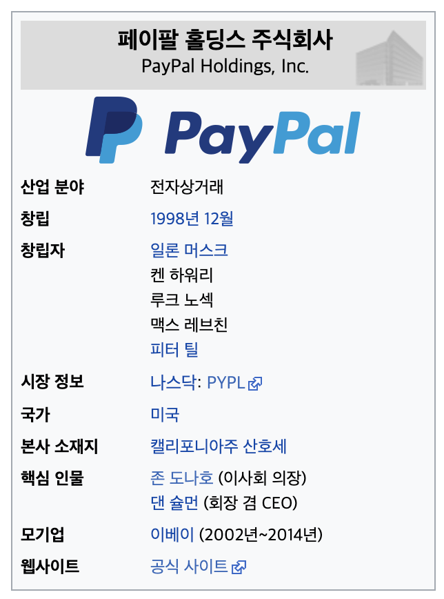 페이팔은 전세계 온라인 간편결제 시스템을 제공하는 기업인데요. 창립자 때문에 들어보신 분들이 꽤나 많으실 겁니다. 바로 테슬라의 수장인 '일론 머스크'가 페이팔의 창립자이기 때문이죠. 페이팔의 창립자 중에는 일론 머스크 말고도 다른 유명인들도 있는데요. 유튜브를 만든 엔지니어인 스티브 첸과 채드 헐리도 있고, 링크드인의 창업자인 레이드 호프먼도 일원이었습니다. 유튜브와 링크드인은 각각 구글과 마이크로소프트에 인수되어 빅테크 기업의 파이프라인이 되었지요.