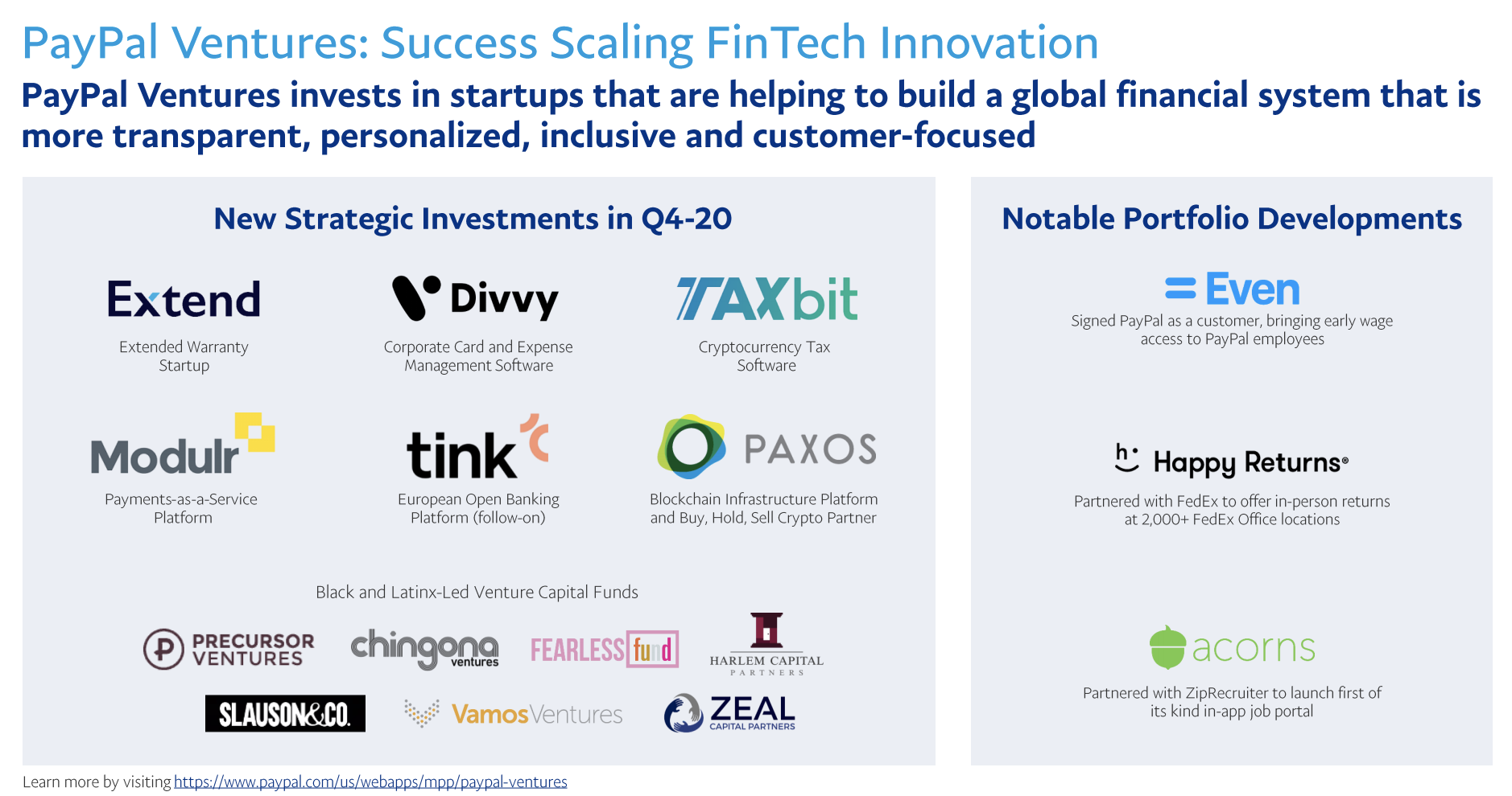 페이팔이 벤처기업으로 시작한만큼 페이팔은 스타트업 기업에 투자를 아끼지 않으면서 좀 더 투명하고, 고객 친화적인 금융 시스템을 조성하는데 기여하고 있습니다. 2020년 4분기에만 해도 택스비트를 포함한 6개 기업에 투자를 결정하였는데요. 장기적인 관점에서 보면 페이팔에게 인수될 기업일 수도 있다고 봅니다.