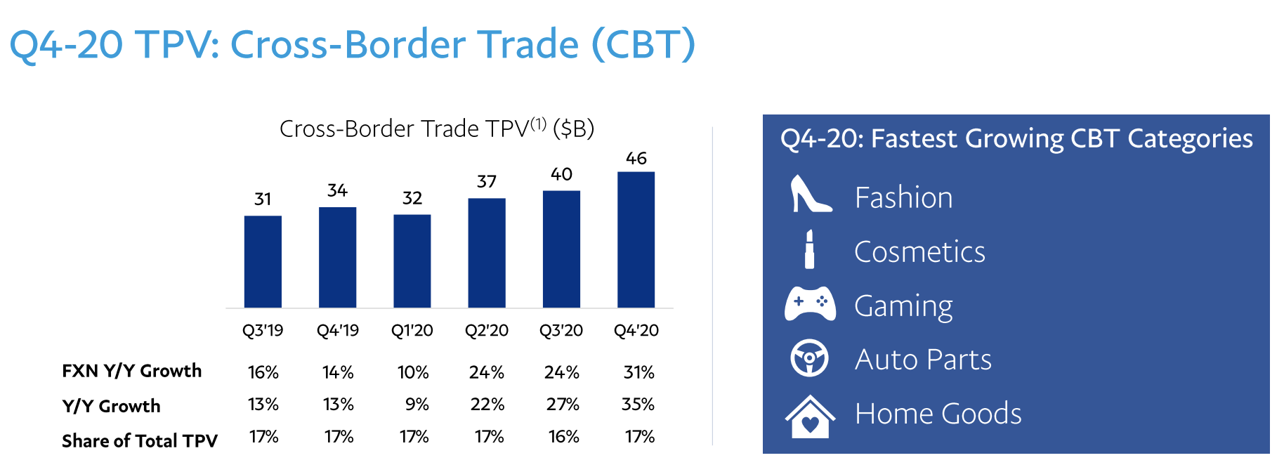 국경간 거래도 35% 증가하였는데, 이 역시 2020년에 최대 증가율을 보여줍니다. 카테고리로 따지면 패션, 화장품, 게임, 자동차, 가구 등의 홈 액세서리 부문이 제일 많이 증가하였네요.