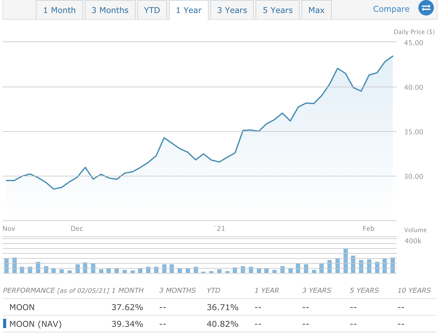 요즘 ARKK, ARKF, ARKG 등의 아크 시리즈가 떡상하면서 비슷한 ETF에 대한 관심도가 높아지고 있는데요. 아크시리즈에 이어서 사람들의 입에 오르내리락 하는 ETF는 바로 Moon ETF입니다. 최근에는 ARK 시리즈보다 수익률이 더 높다고 하여 슬슬 입소문을 타고 있는데요. Moon ETF는 이름만 들어서는 달나라 관련 ETF 같아서 앞으로 출시될 우주 ETF인 ARKX의 대항마인가... 싶기도 할텐데 그건 아닌 듯 합니다.