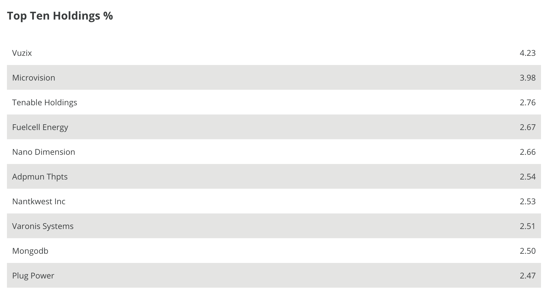 총 50개의 혁신기업에 투자하고 있으니, 만약에 동일 비중이라면 각 2%씩 보유할텐데 Vuzix라는 기업이 4.23%로 보유비율 1위입니다. 사실 저 기업들 중에 한 번이라도 들어본 기업이 마이크로비전, 퓨어셀에너지, 나노디맨션인데 다 대형주가 아니라 소형주라는 게 특징이네요.