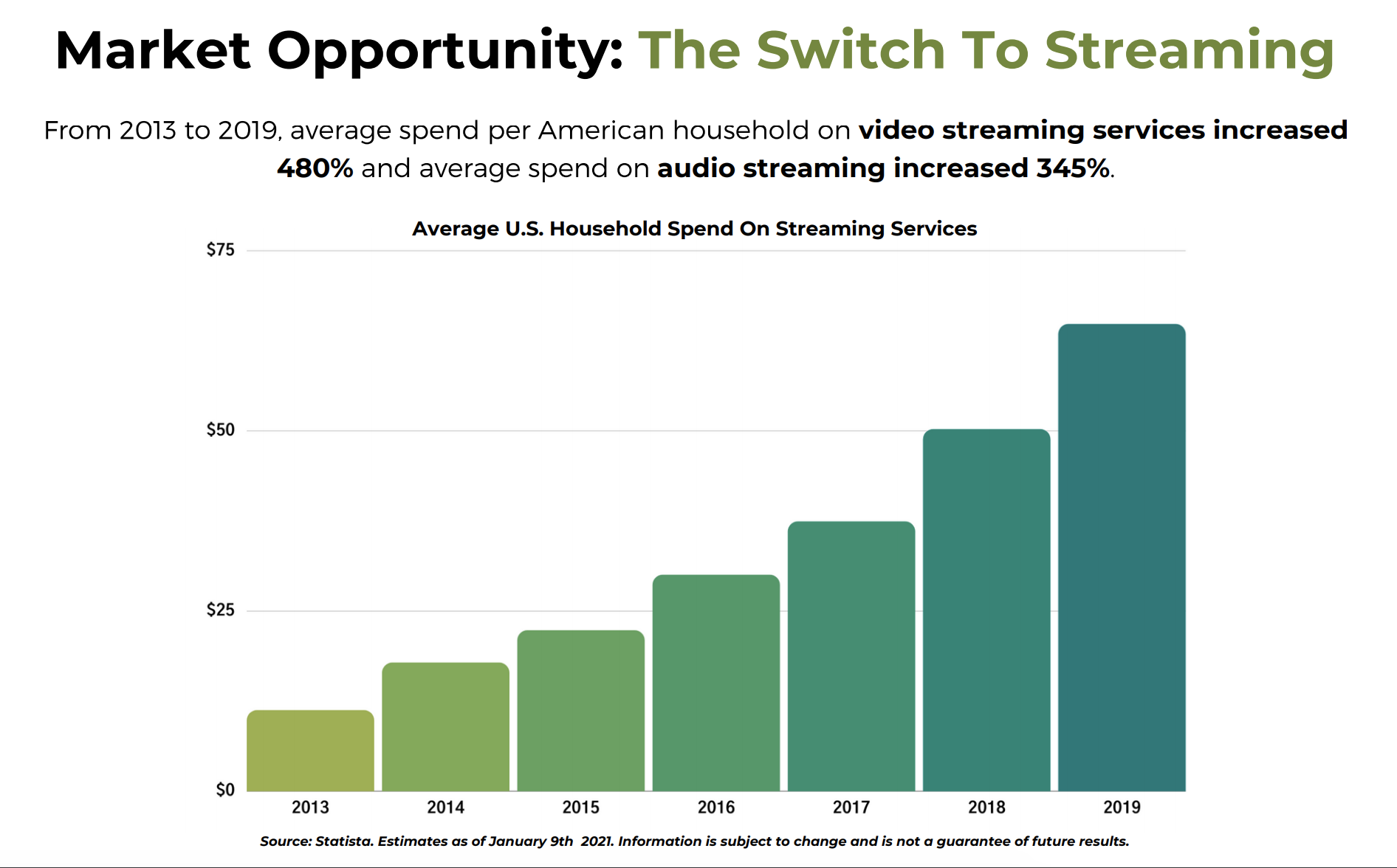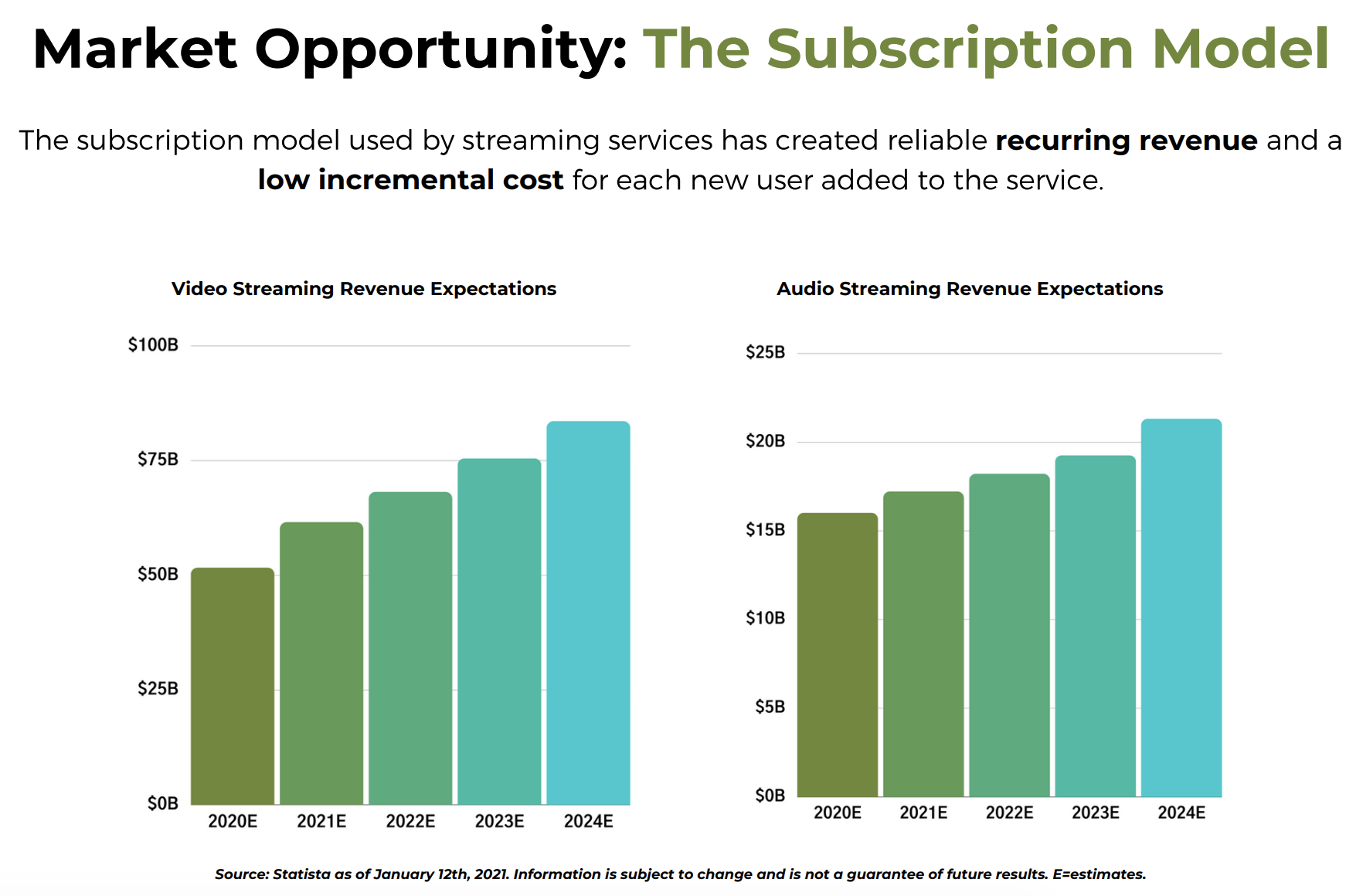 우선, 돈이 몰리는 산업입니다. 2013년부터 2019년까지 미국인이 매달 지출하는 스트리밍 구독료는 약 11불에서 65불까지 증가하였습니다. 넷플릭스나 디즈니 플러스와 같은 비디오 스트리밍 서비스의 구독료는 480%, 오디오 스트리밍 서비스의 구독료는 345% 증가율을 보였다고 합니다.