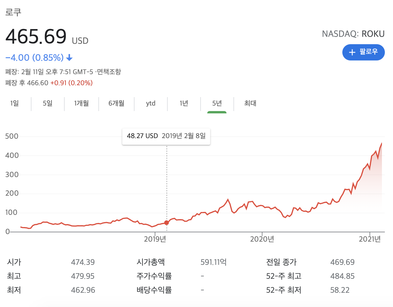 스트리밍 서비스를 한 군데에서 볼 수 있도록 하는 로쿠는 2년 전과 비교하면 무려 10배 상승한 기염을 토하고 있는데요. 컨텐츠 제작 기업이 아니더라도 스트리밍 산업에서 수익 모델을 창출한 예시가 됩니다.