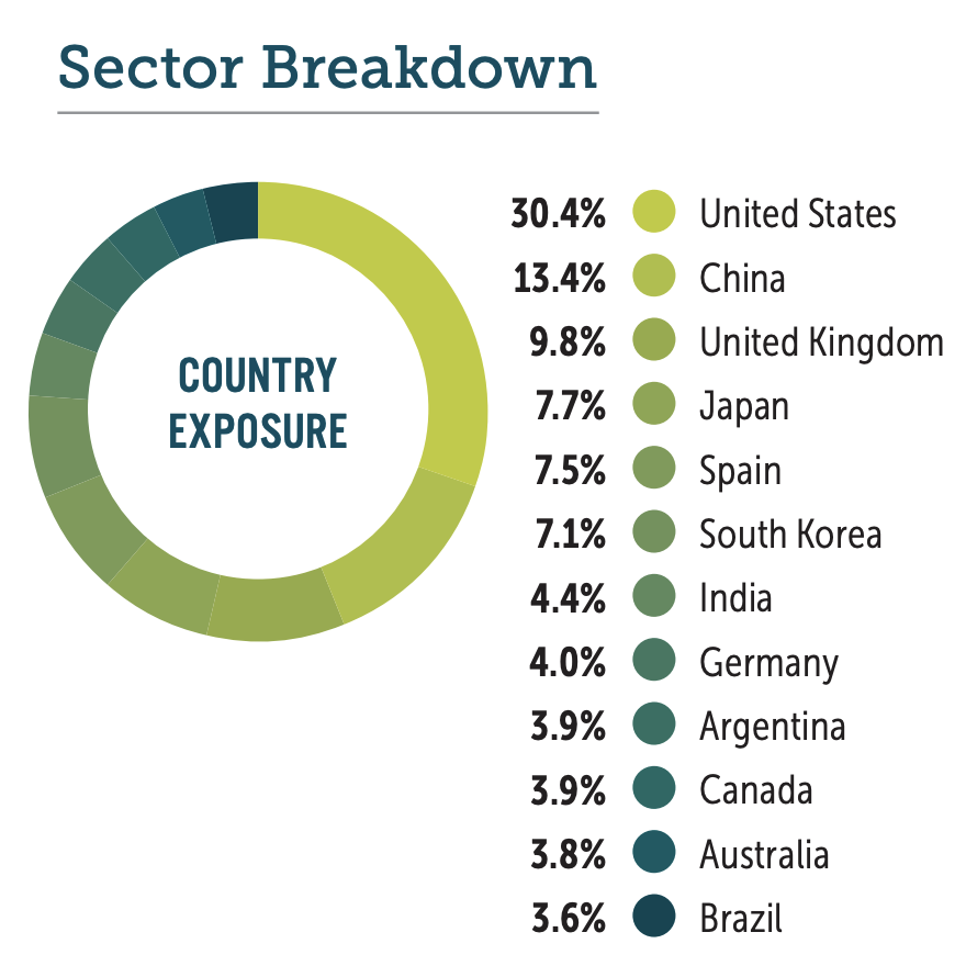 해당 etf는 미국 기업 뿐만 아니라 미국 외의 글로벌 기업에도 투자하는데요. 미국이 30%의 비중, 중국 13.4%, 영국 9.8%의 비중 순으로 10개 이상의 나라로 분산되어 있습니다.
