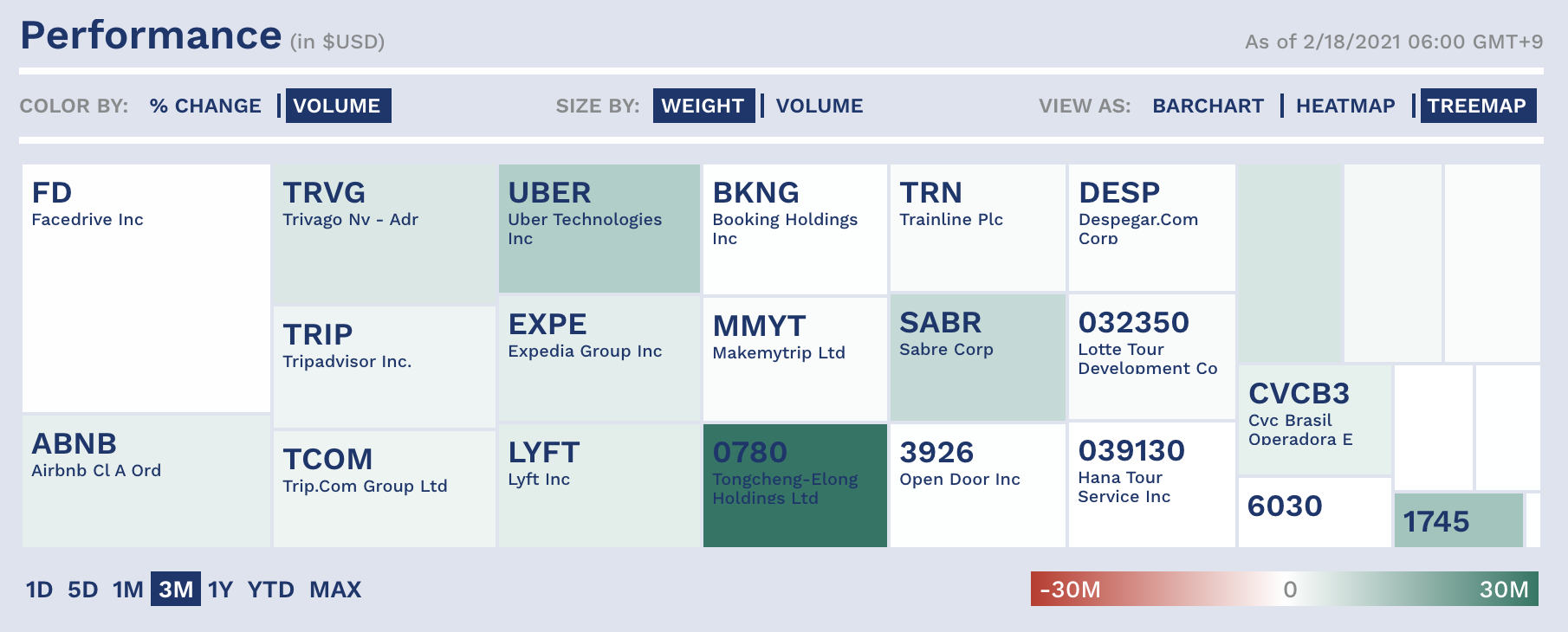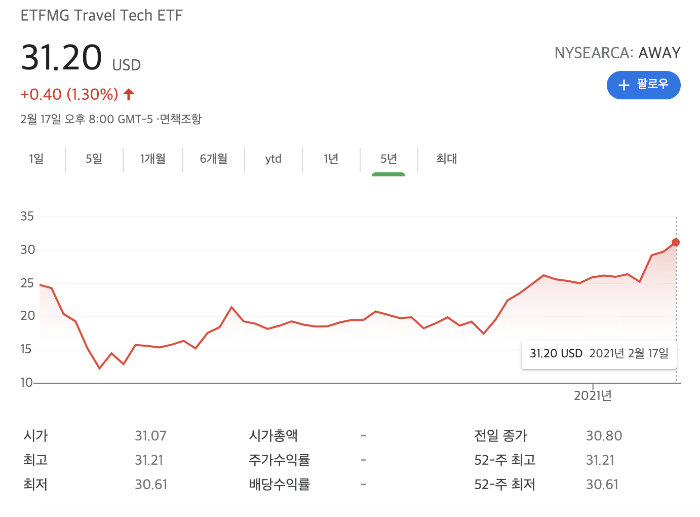 사실 넘치는 유동성으로 인해 이미 코로나 전 고점에 다다른 종목들이 꽤 많습니다. 부킹홀딩스, 메리어트, 익스피디아, 춘추항공 등 아직 정상적으로 운영을 하지 않더라도 기대감으로 인해 주가가 회복이 되었죠. 개별 여행주가 조심스럽다면 ETF로 접근하는 것도 좋은 방법인데요. 물론 개별 주식만큼의 수익은 내지 못하겠지만 분산투자를 통해 비교적 안정적인 투자를 할 수 있다는 게 큰 장점입니다.