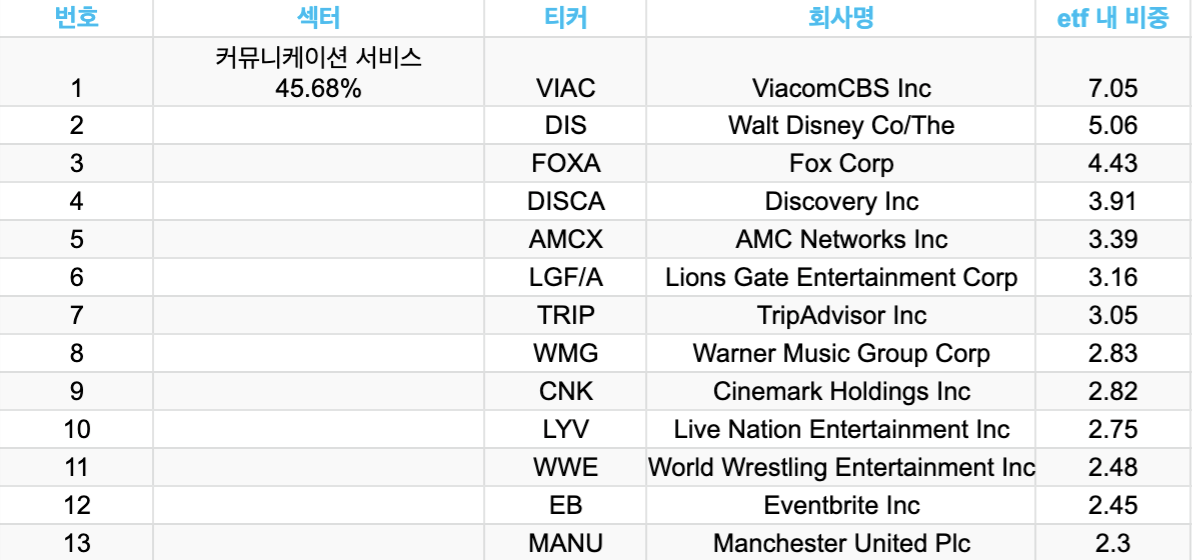 커뮤니케이션 서비스 섹터가 45.68%로 영화, 레슬링, 테마파크, 축구 등의 엔터테인먼트 기업들로 구성됨을 확인할 수 있습니다. 포함되어 있는 기업들이 코로나 시국에 선방을 한 기업도 있지만 아닌 기업들이 더 많은 것으로 보이네요.