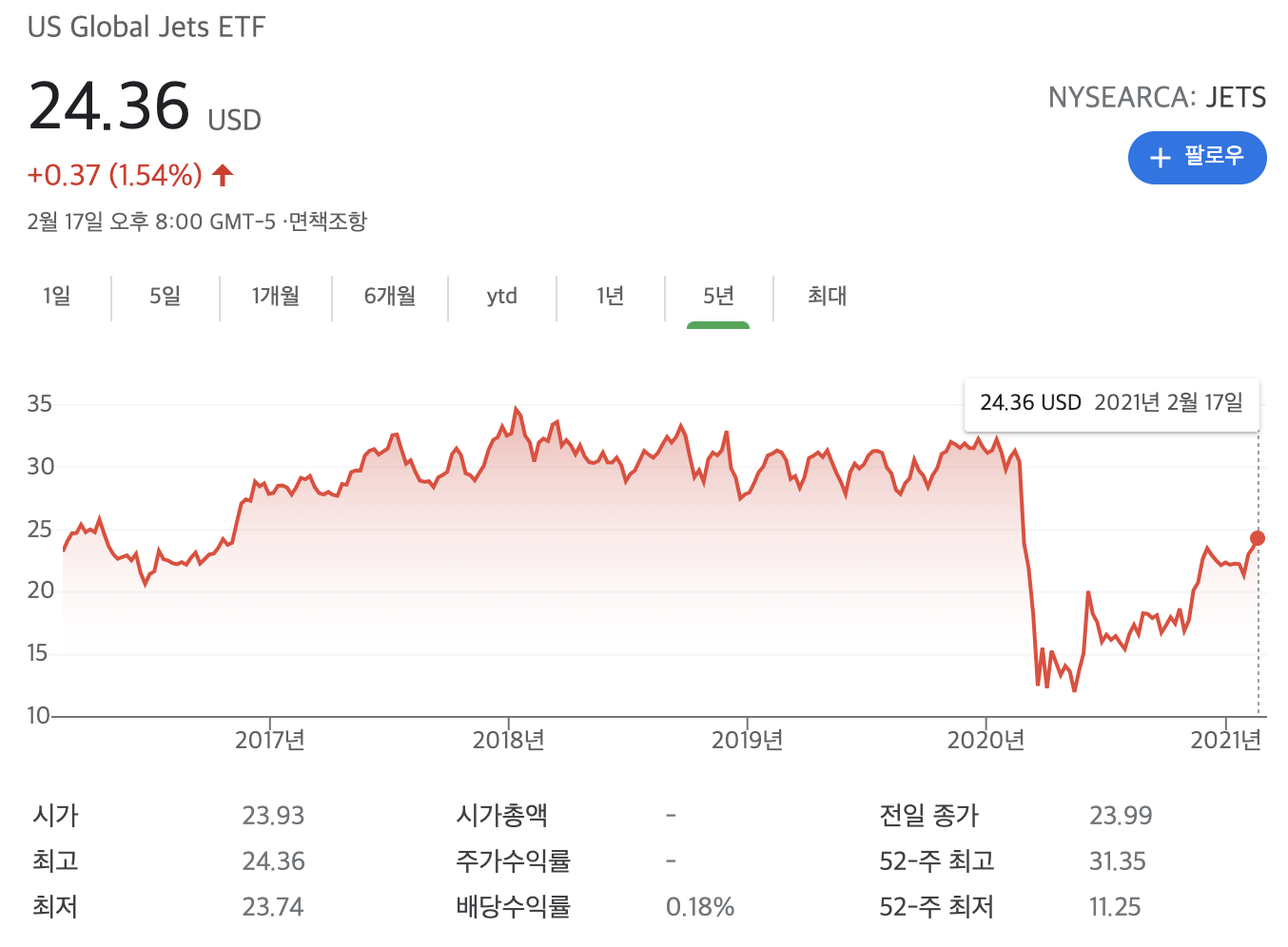 개인적으로 JETS는 언제 여객기가 뜰지 모르니 조심스럽긴 하나, 만약에 장기적으로 투자를 하시는 분이라면 투자한다면 언젠가는 빛을 보는 ETF라고 생각합니다.
