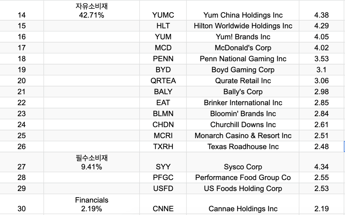 필수소비재 섹터는 9.41%로, 식품 유통망을 담당하는 기업들로 구성되어 있습니다. 파이낸셜 섹터에 있는 cannae holdings는 금융 섹터로 분류되어 있지만 외식업에 투자하는 기업이라고 하네요.