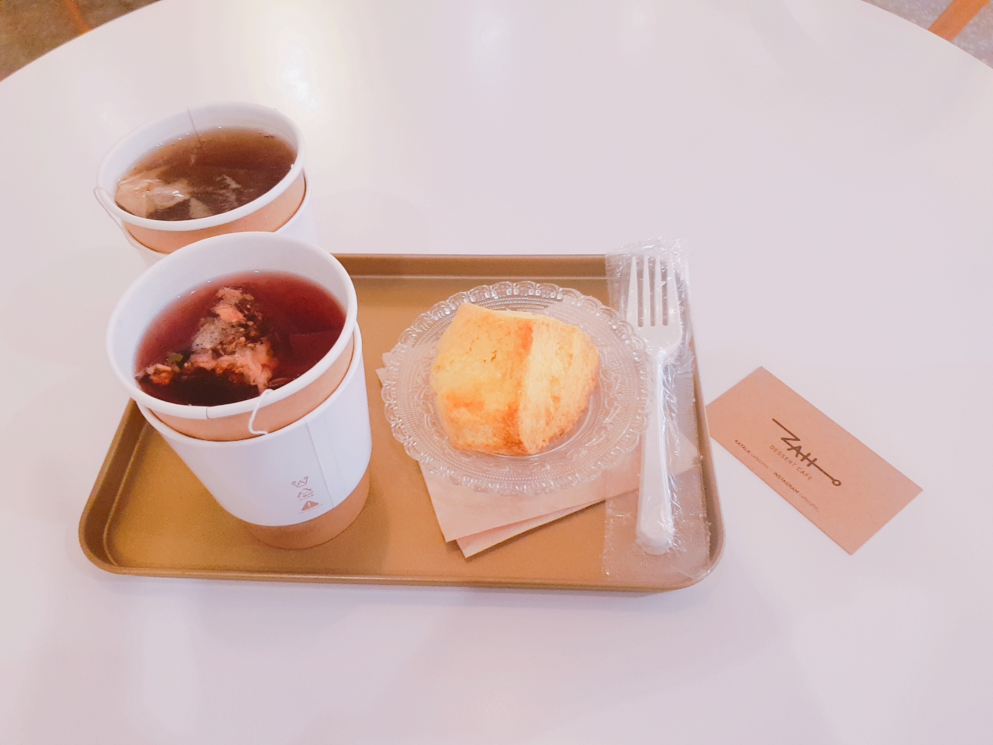 주문한 메뉴를 자리에 서빙해주셨어요. 특히 히비스커스티는 다른 티백과 다르게 상큼한 맛 보다는 약재? 맛이 강했어요. 저는 맛있게 마셨는데 남자친구의 입 맛에는 안 맞았다고 하네요. 주문한 스콘은...비주얼에 비해 맛이 별로였어요. 퍽퍽한 스콘인 편이라 그런지 부스러기가 많이 나와 먹기 힘들었어요. 일회용 포크라서 눌러먹기도 번거로웠답니다. 솔직히 비추해요. 하지만 다른메뉴는 맛있어 보여 다음에 와서는 다른 디저트를 도전하기로 했어요.