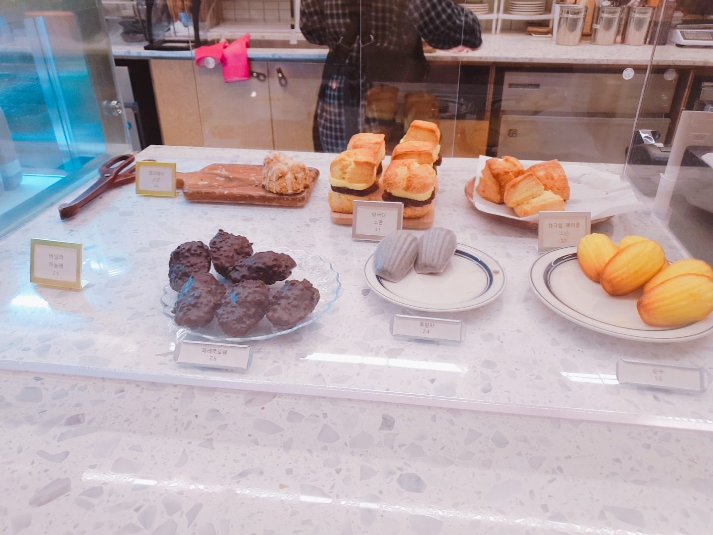 들어가서 바로 메뉴를 주문했답니다. 제가 제일 좋아하는 디저트가 한가득이었어요. 스콘으로는 앙버터스콘(4.5), 얼그레이스콘(4.0), 메이플시럽이 한층 씌여진 버터 스콘(3.5)이 있었고 마들렌은 빼레로로쉐, 흑임자,기본 맛(2.5~3.5)이 있었어요. 아마 저녁에 늦게 간 탓인지 솔드아웃된 디저트도 있더라고요.
