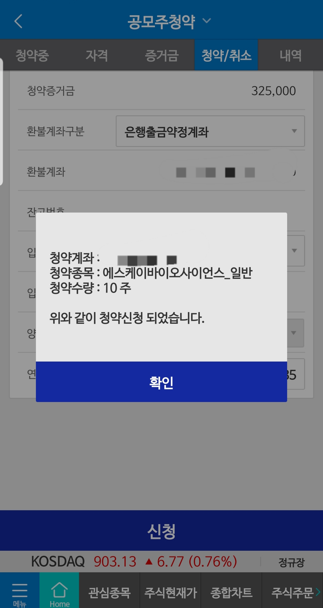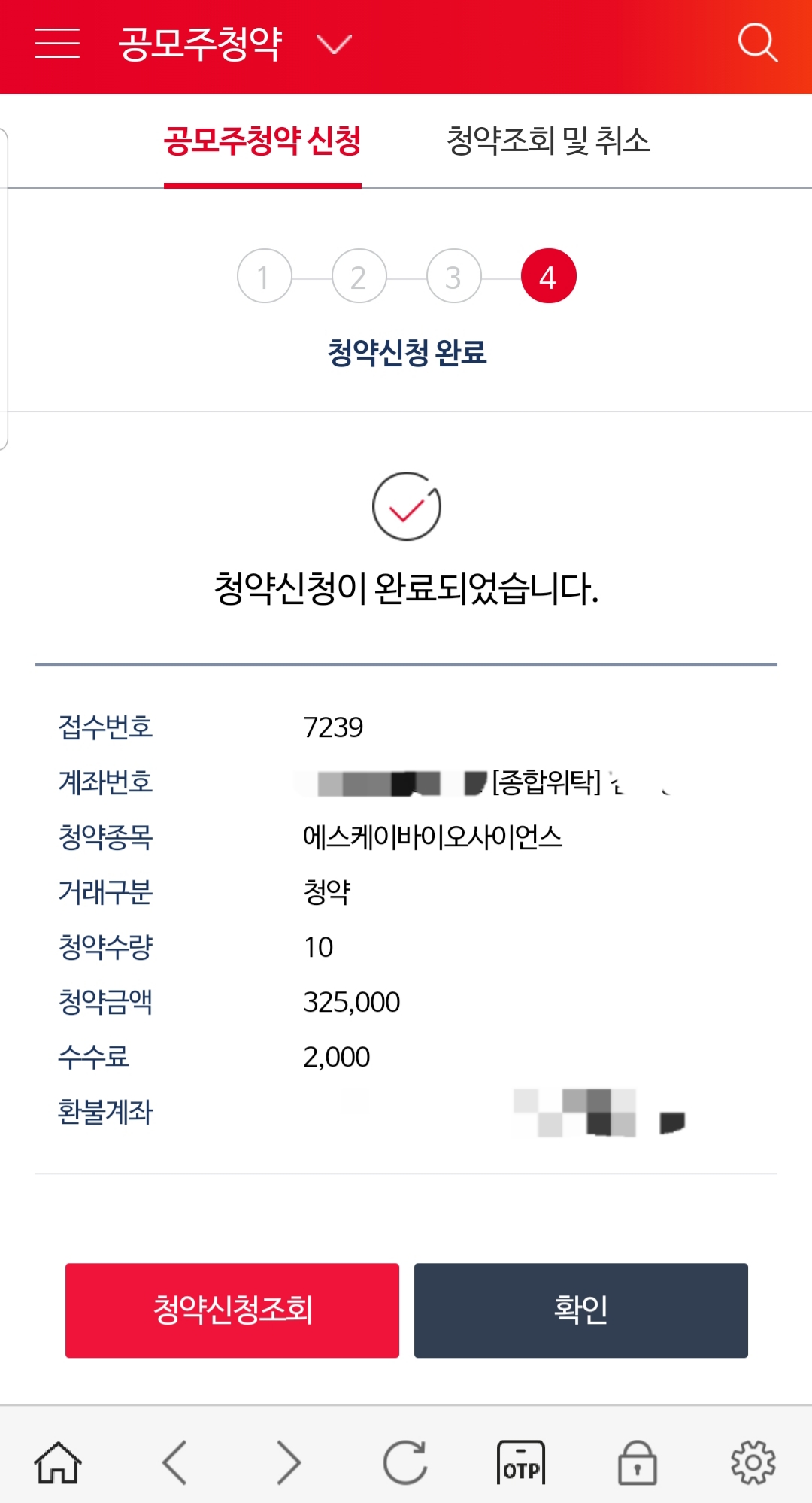 SK증권과 삼성증권 앱도 다시 설치해서 부랴부랴 청약 신청을 했습니다. SK증권은 제가 시럽으로 5% 적금을 들었던지라 증권앱을 처음 켜봤는데 대형 증권사보다 UI가 떨어지더라구요. 수수료도 2,000원 내야하기에 증권사 계좌에 입금할 때 수수료까지 고려해야 합니다.