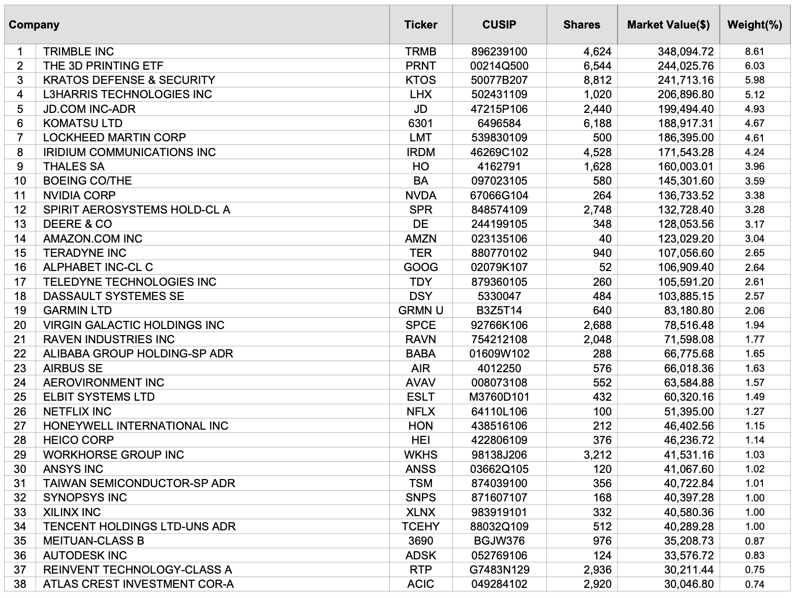 ARKX의 편입종목이 무엇인지 살펴보겠습니다. 3월 30일 기준으로 총 38개 기업 혹은 ETF에 투자되는 상황인데요. 편입종목은 리밸런싱에 따라 달라질 수 있고 보유 비중 역시 달라질 수 있는 점 참고하시기 바랍니다.